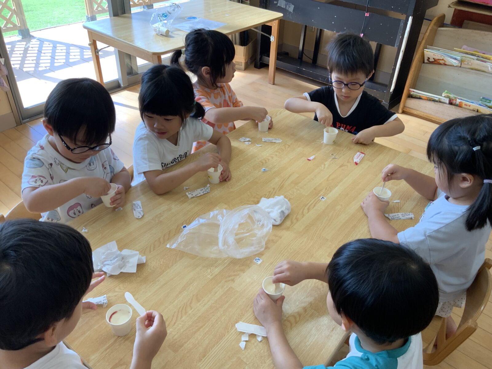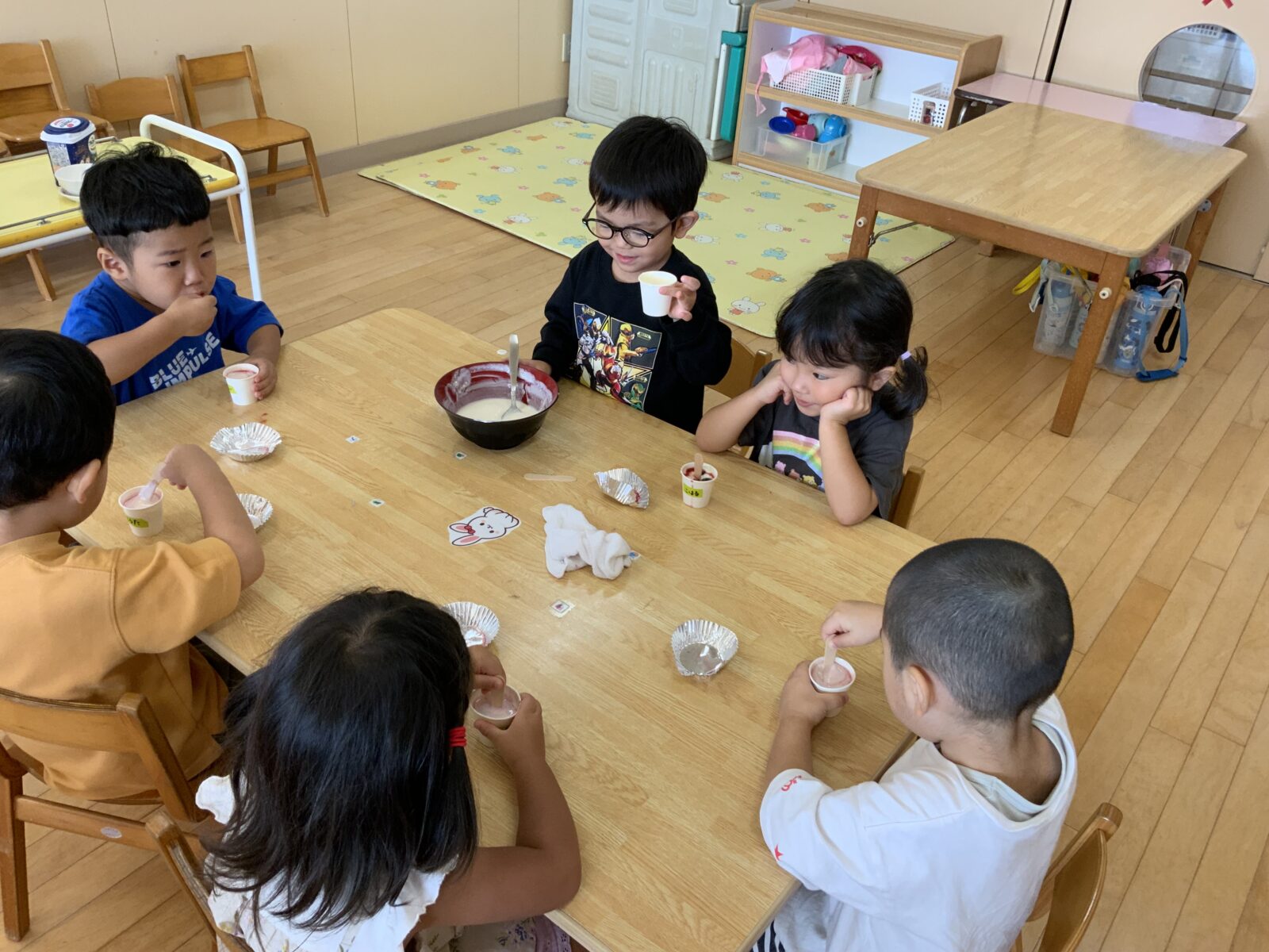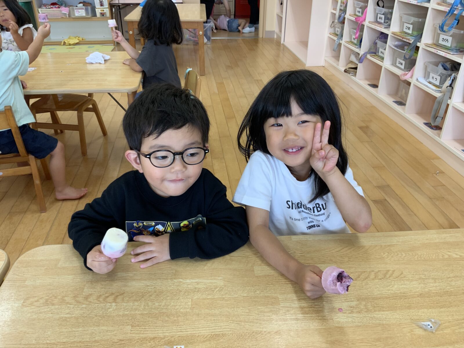 9月に8月号の月刊誌にアイス作りが載っていたので、みんなで園庭で育ったブルーベリーを使ってアイス作りをしました。