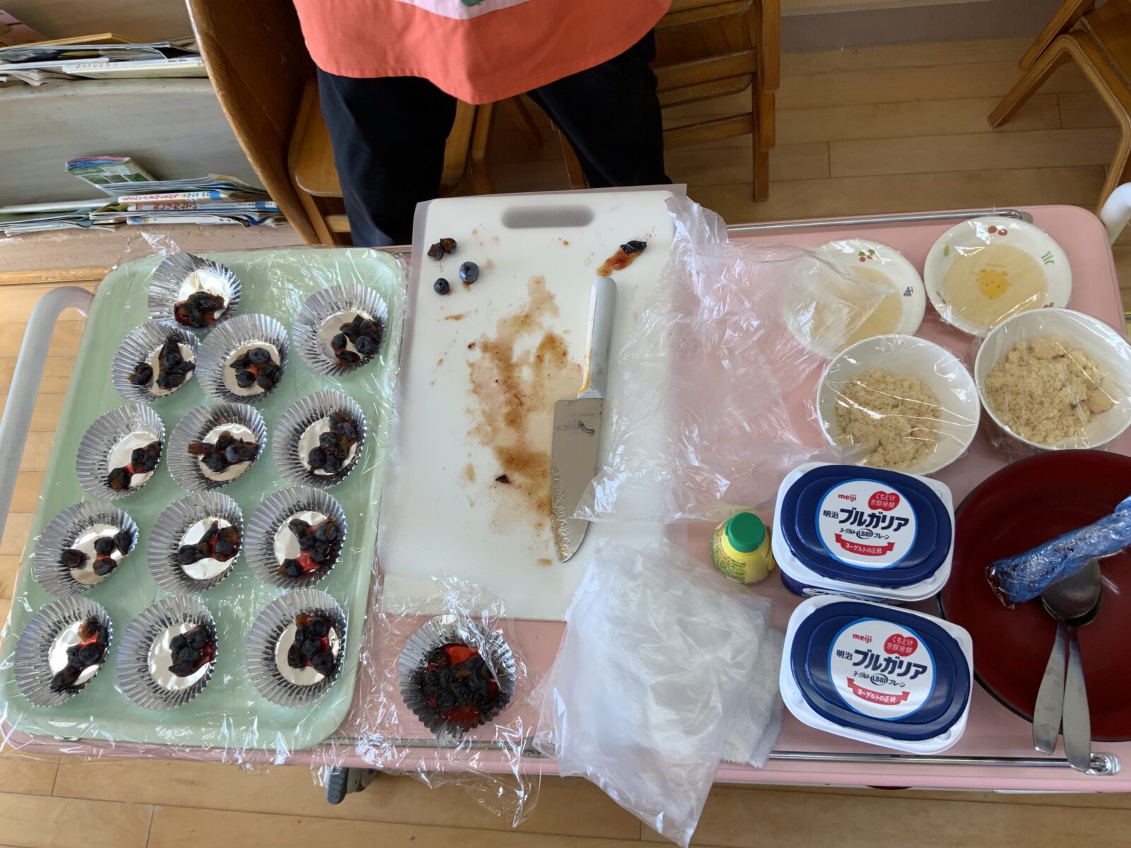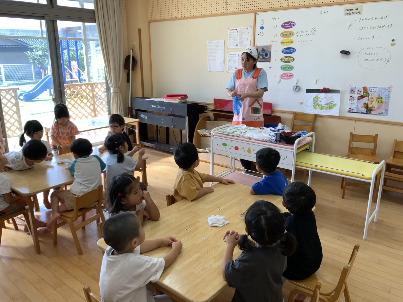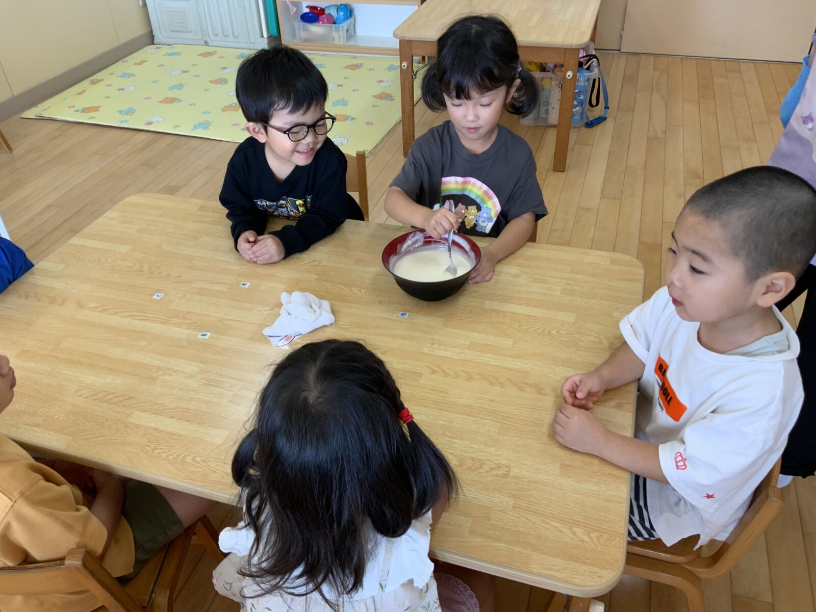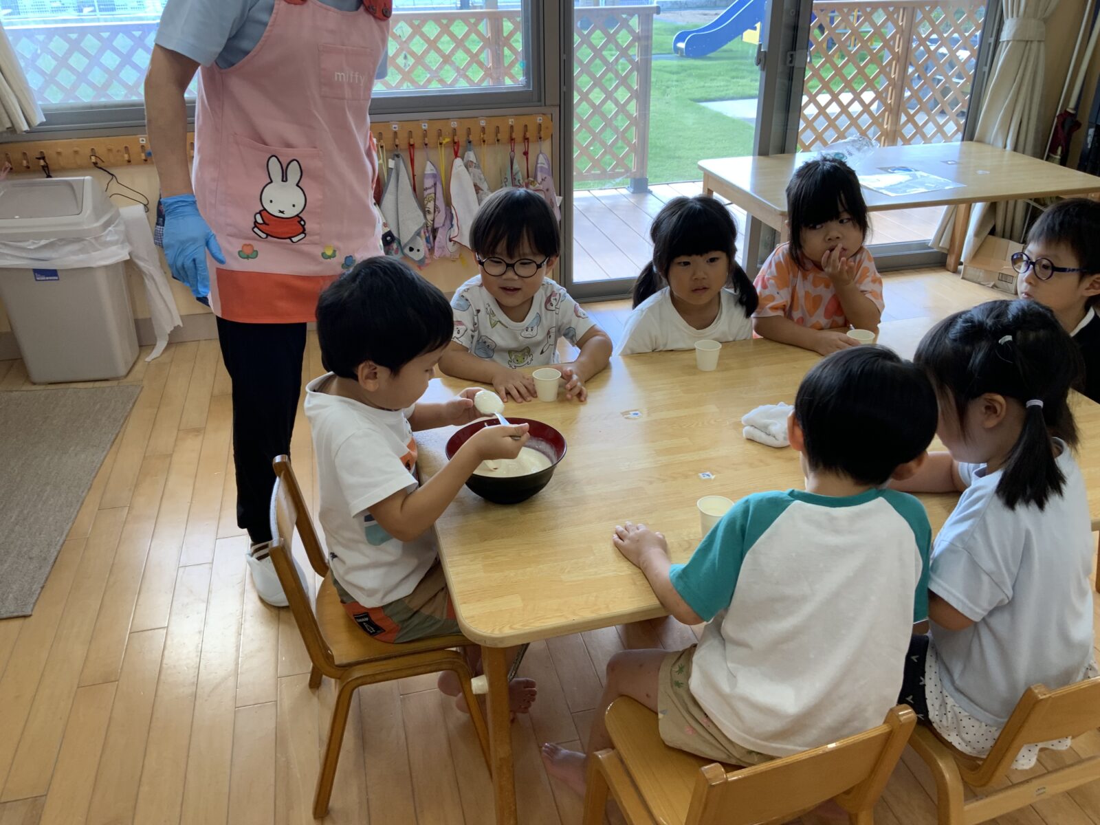 9月に8月号の月刊誌にアイス作りが載っていたので、みんなで園庭で育ったブルーベリーを使ってアイス作りをしました。