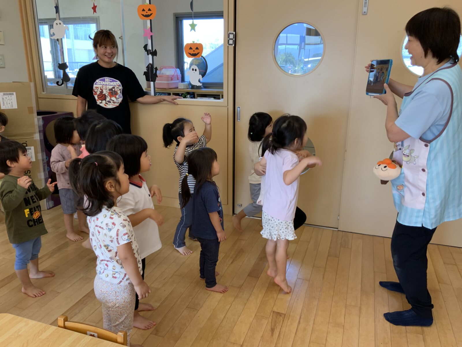 今月は”body parts”に取り組んでいるのでカードを使って発音練習をした後は・・・みんなでハロウィンパーティー!!!