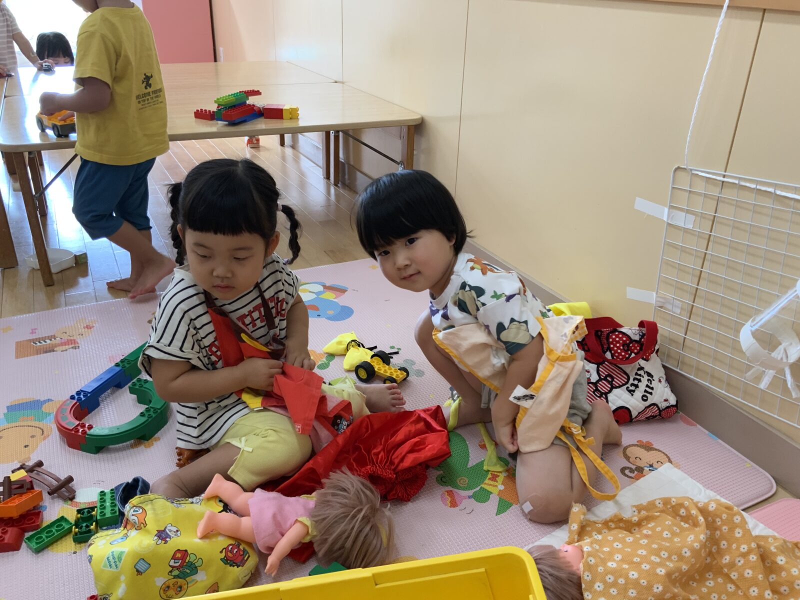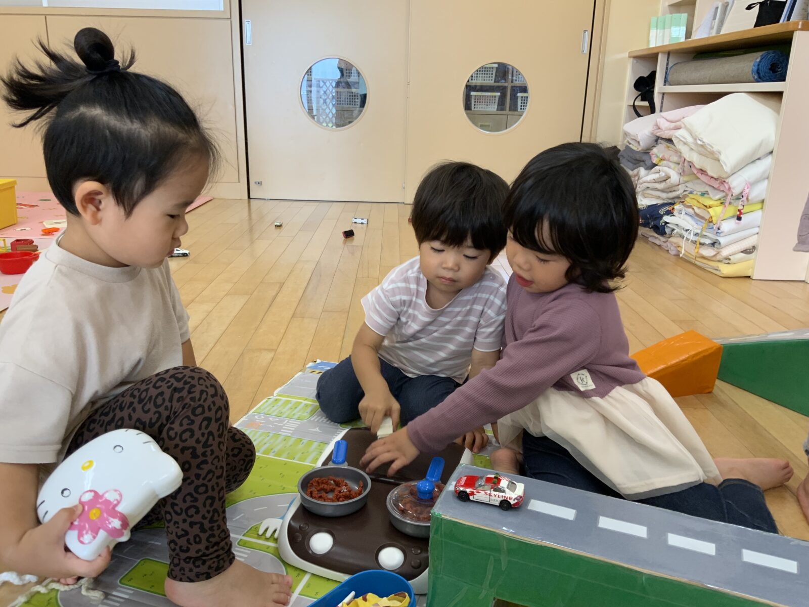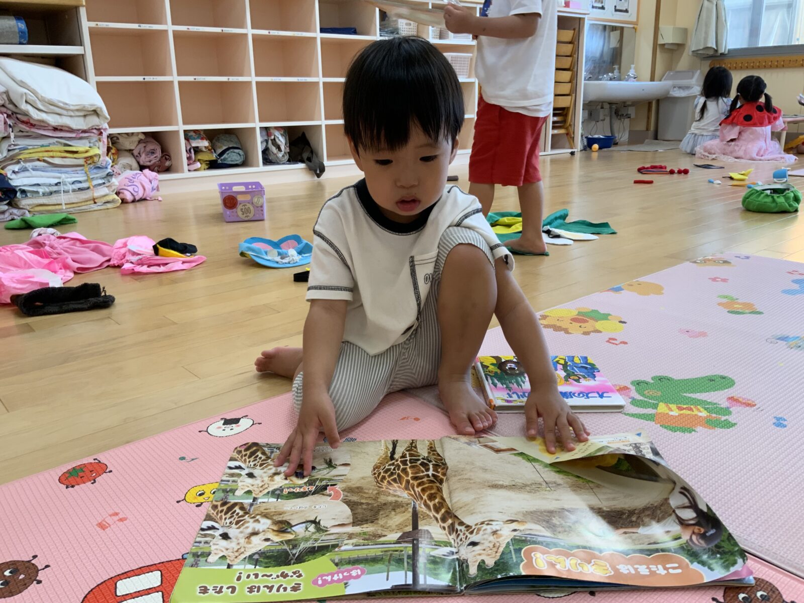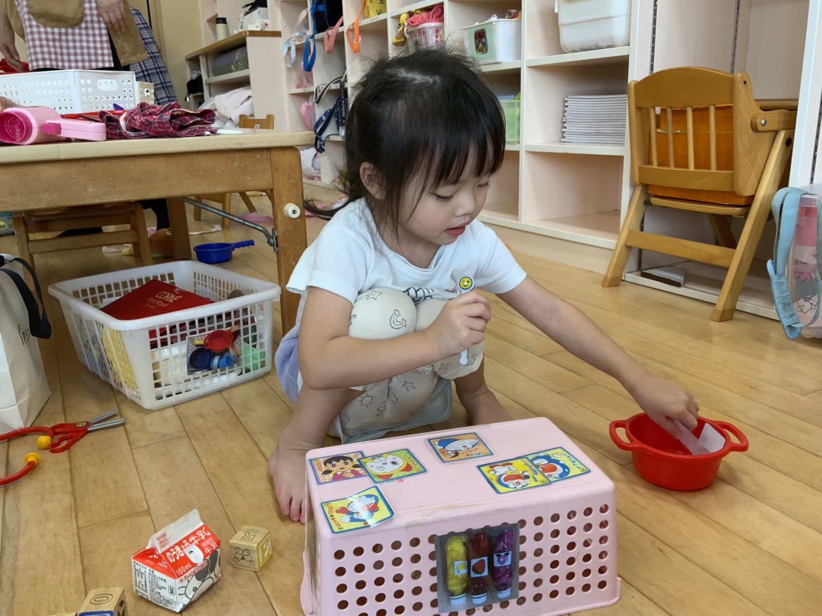 いつもとは違った環境に少し不安げな表情を見せる姿も見られましたが、すぐに慣れ、絵本を見たりままごとをしたりと好きな遊びを見つけ楽しんでいますよ。