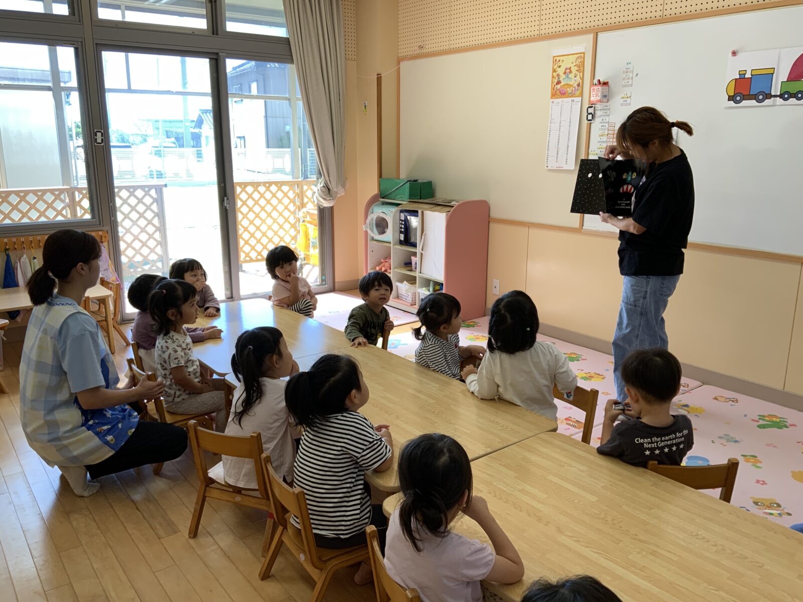 初めに子どもたちのリクエストで”BIG GREEN MONSTER”の絵本を読んでもらいました。