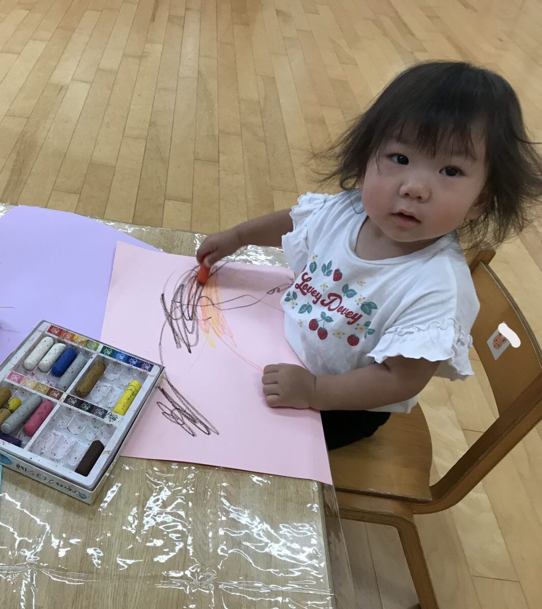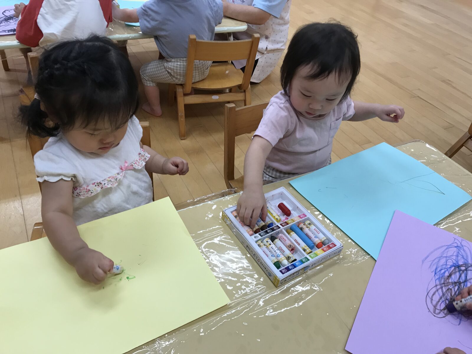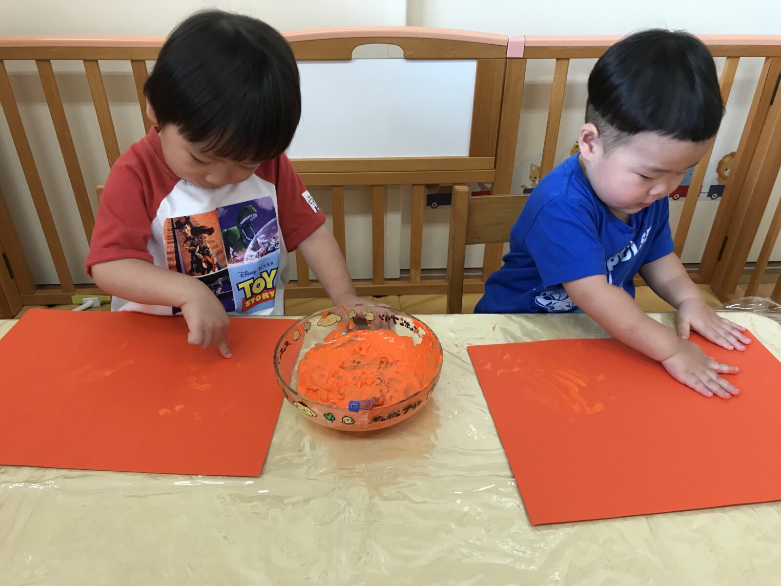 初めは絵の具の感触に戸惑いを見せる子もいましたが、慣れてくると自分から絵の具の器に手を入れて描くことを楽しんでいましたよ!