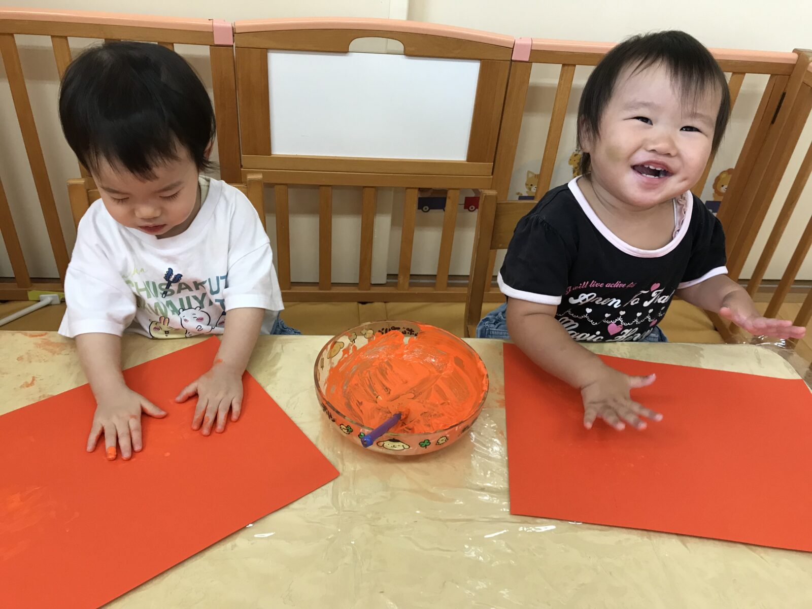 ハロウィン製作では、フィンガーペインティングで『かぼちゃのかばん』を作りました。