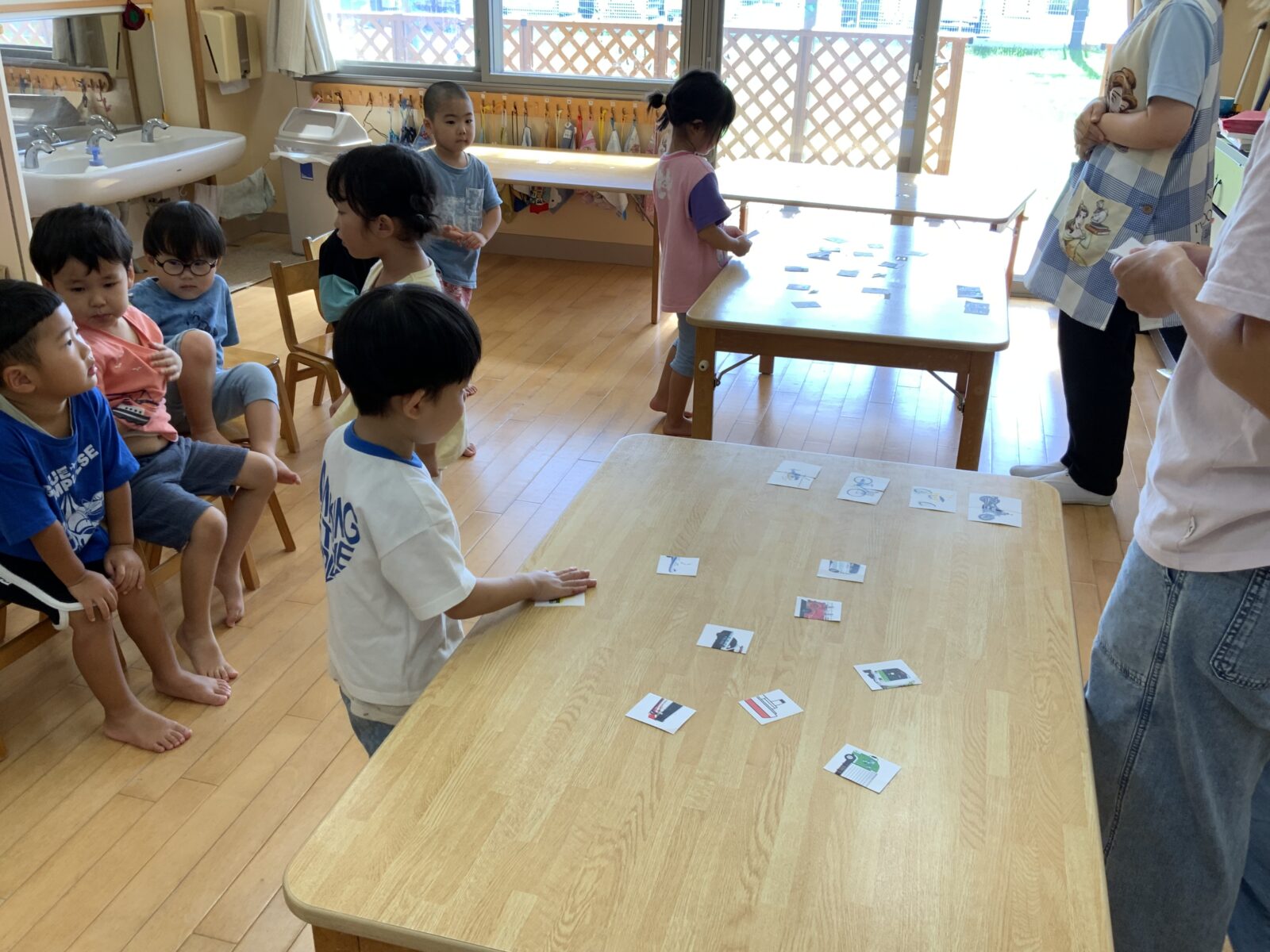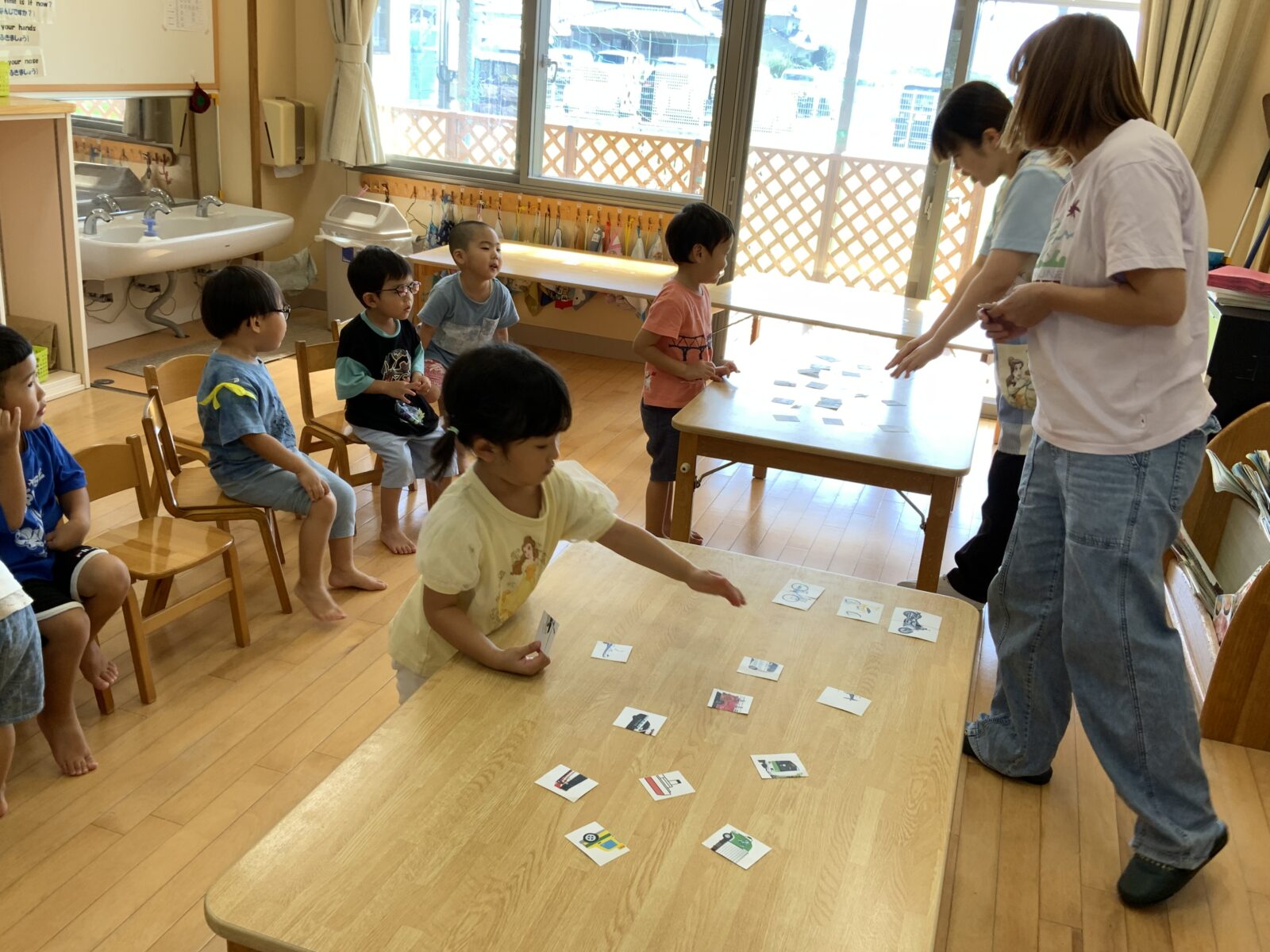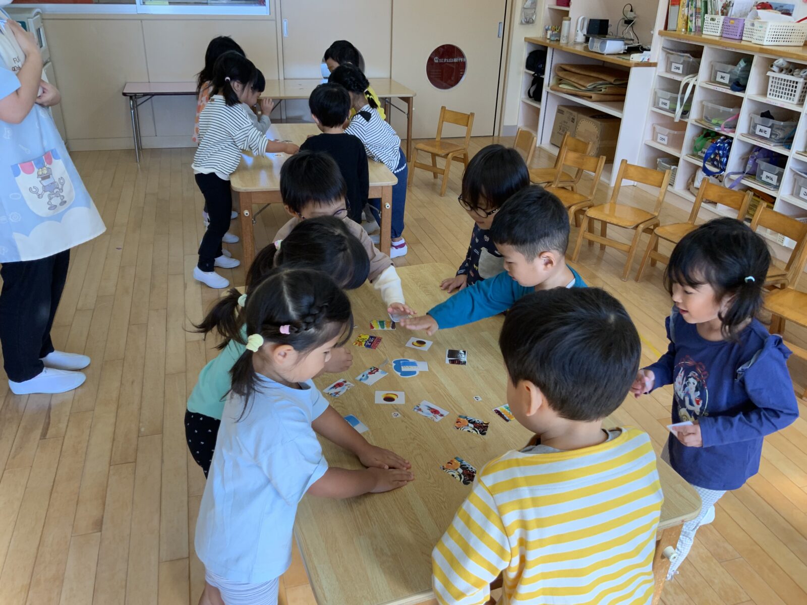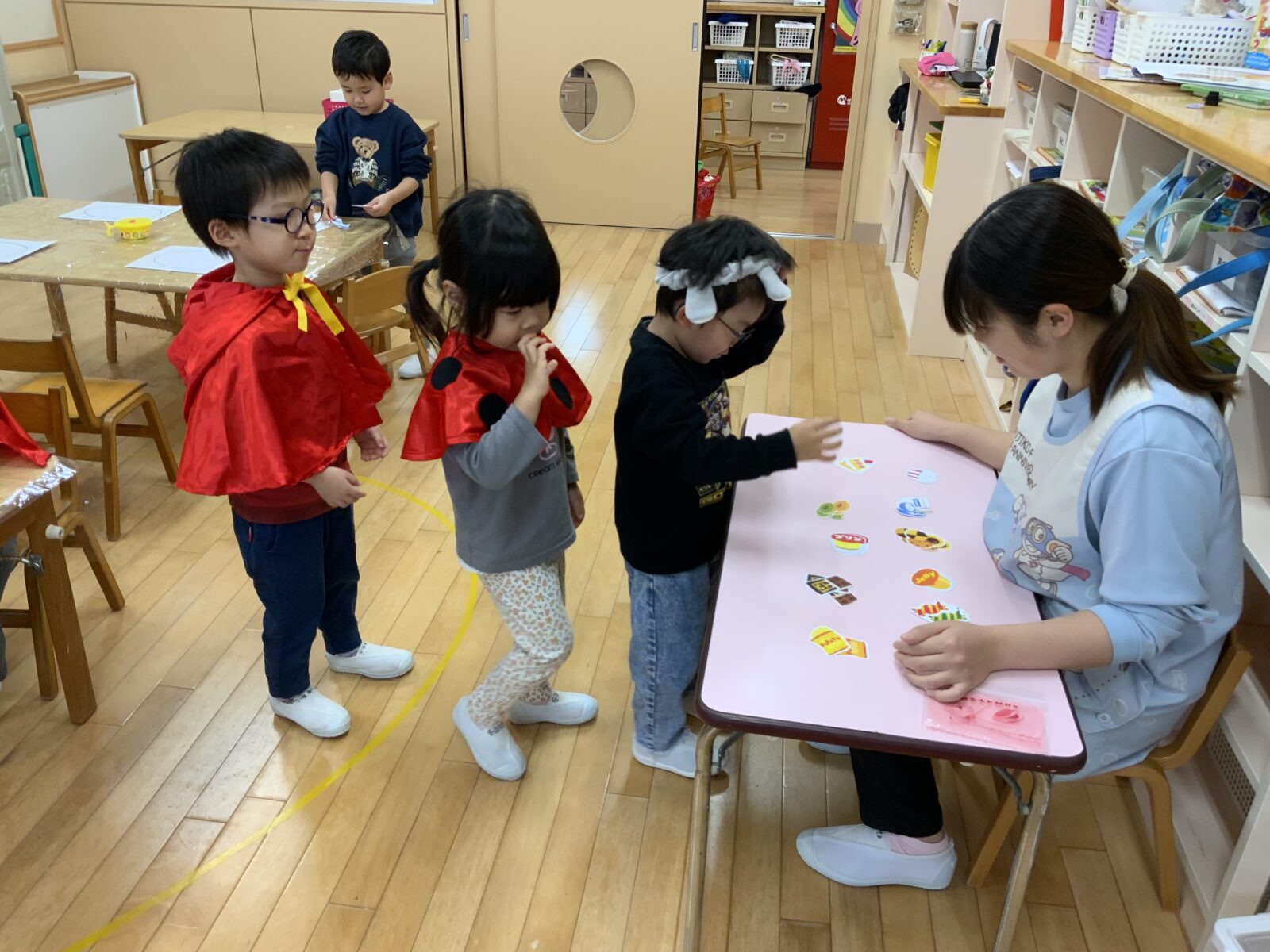 「きょうつけ ピッ!!」と言うとちゃんときょうつけをしていましたね。お菓子のカードも複数あるのでケンカもなくとても上手にしていましたよ。( ^)o(^ )