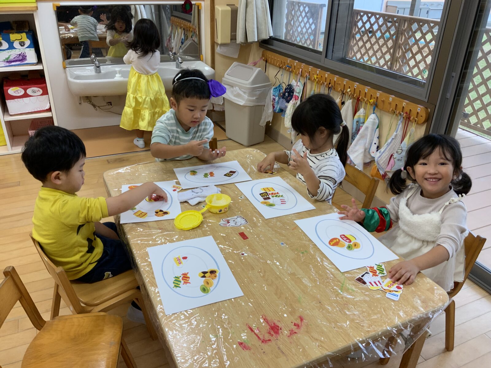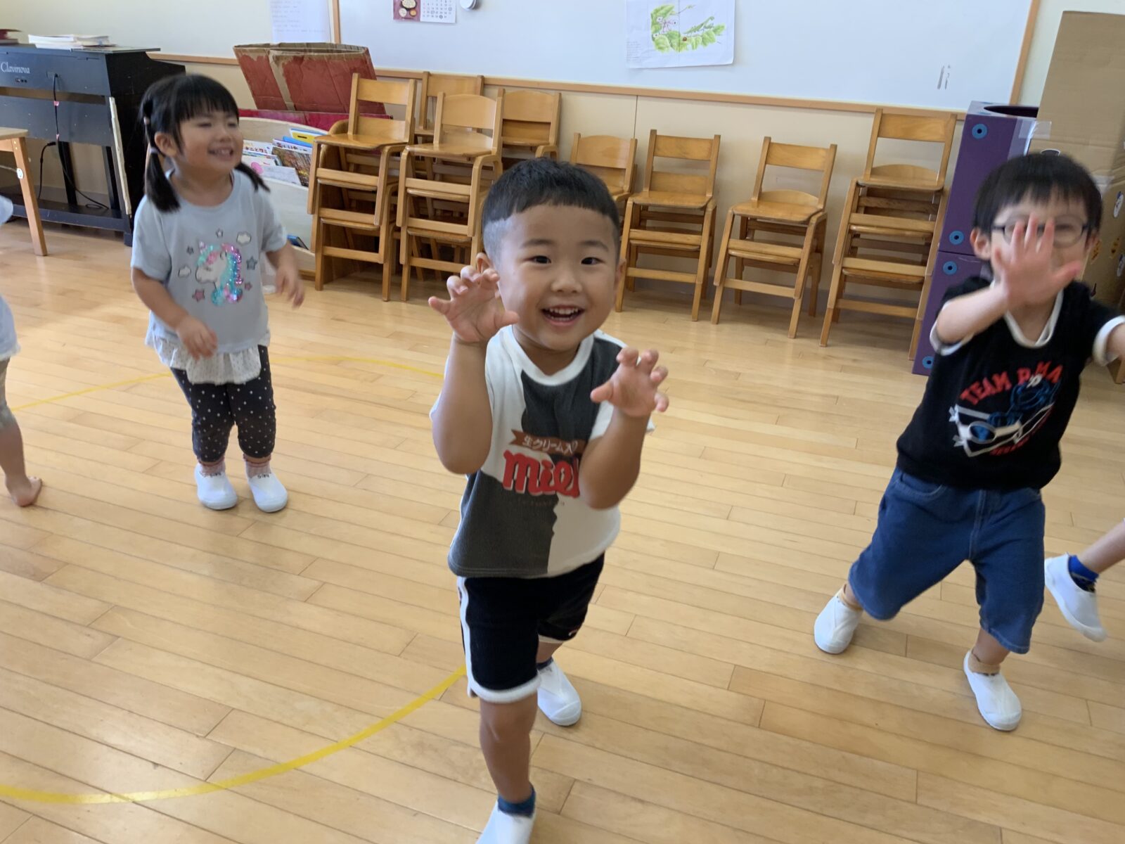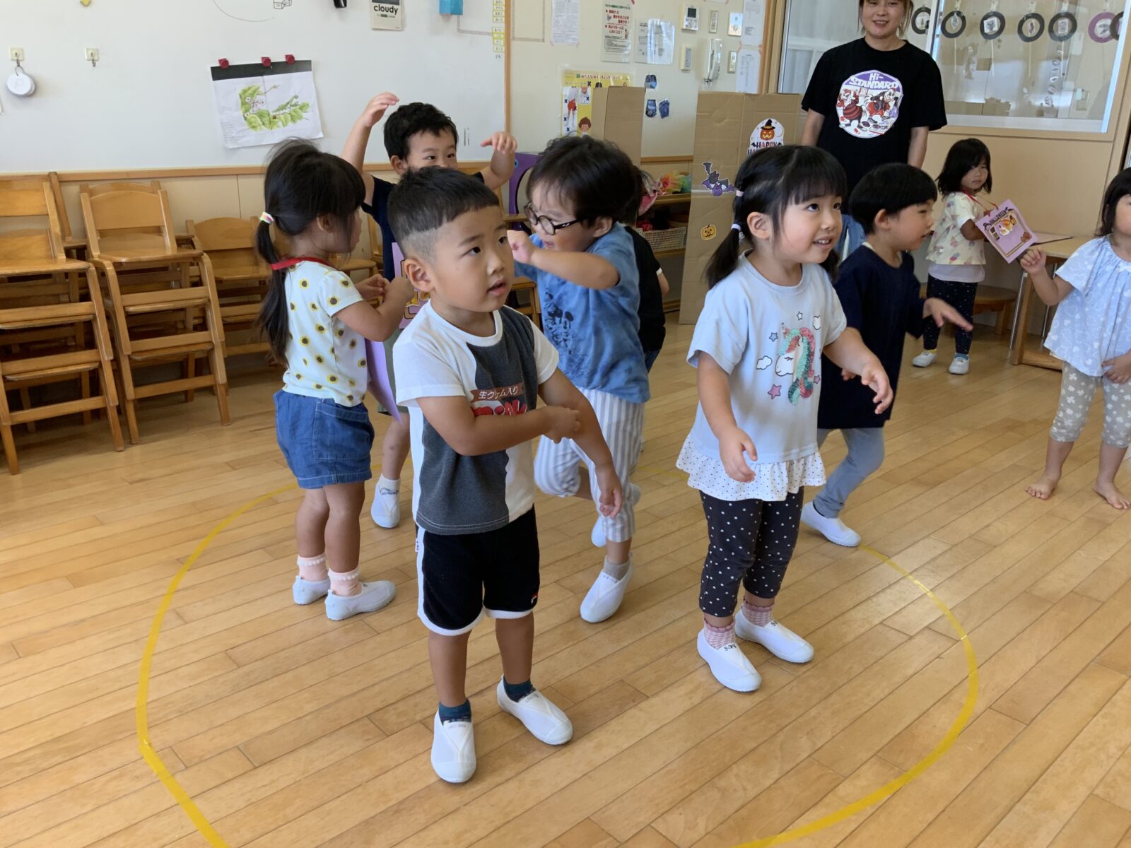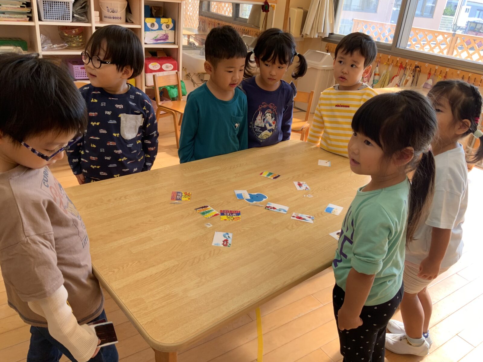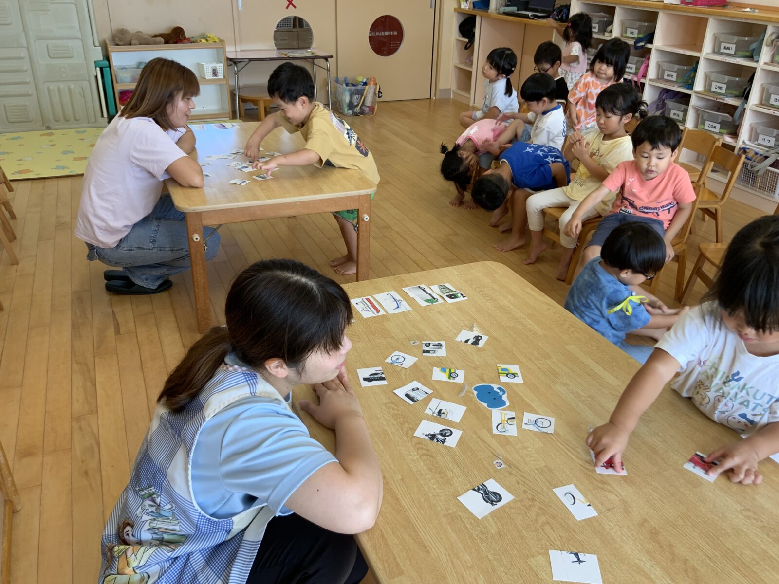 「きょうつけ ピッ!!」と言うとちゃんときょうつけをしていましたね。お菓子のカードも複数あるのでケンカもなくとても上手にしていましたよ。( ^)o(^ )