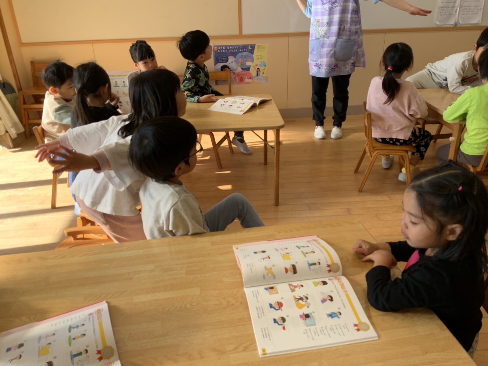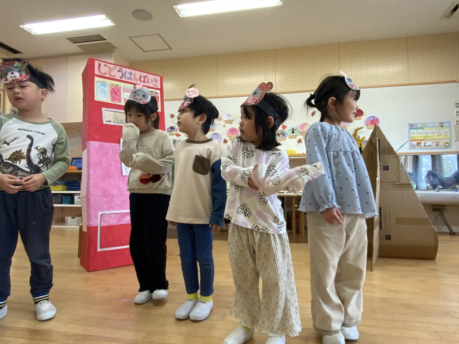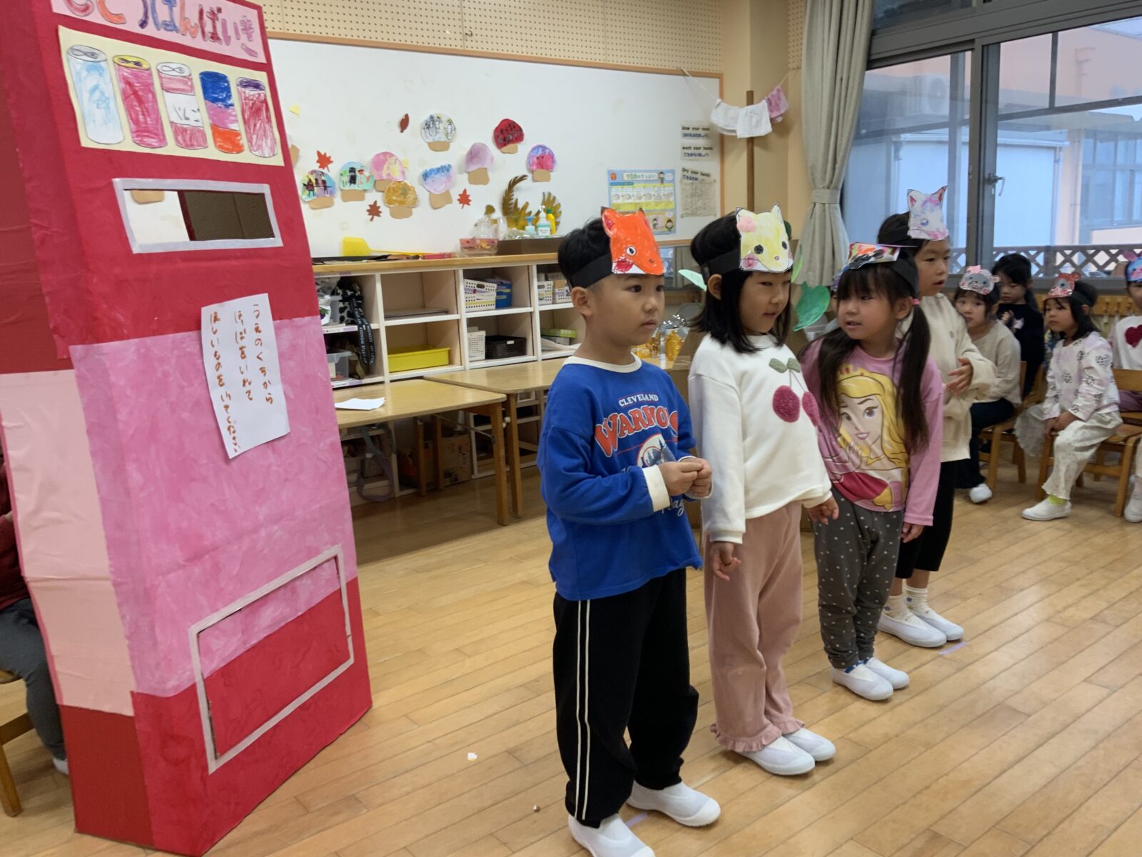 【4,5歳児】英語の様子とHAPPYフェスティバルの練習頑張っているよ。 投稿日: 2025年11月28日2025年11月28日 投稿者: すえさみこども園 最近は5歳児は英検に向けて少しずつテキストの問題を解いてみていますよ。3択問題からどれかな~?と考えて正解を選んでいますよ。4歳児も一緒にやってみています。 HAPPYフェスティバルに向けて毎日練習を頑張っている子どもたち。ぽんたのじどうはんばいきの大道具、小道具も子どもたちと一緒に作りました。 ナレーター、セリフも覚えてきて大きな声で言えるようになってきました。 保護者の方に見に来てもらえることをとても楽しみにしているみんなです♡ 関連記事: [3歳児] お正月あそび・こままわし [2歳児] 今週のちゅうりっぷ組さん {5歳児} 夏の思い出づくり [0歳児]蓮池公園
