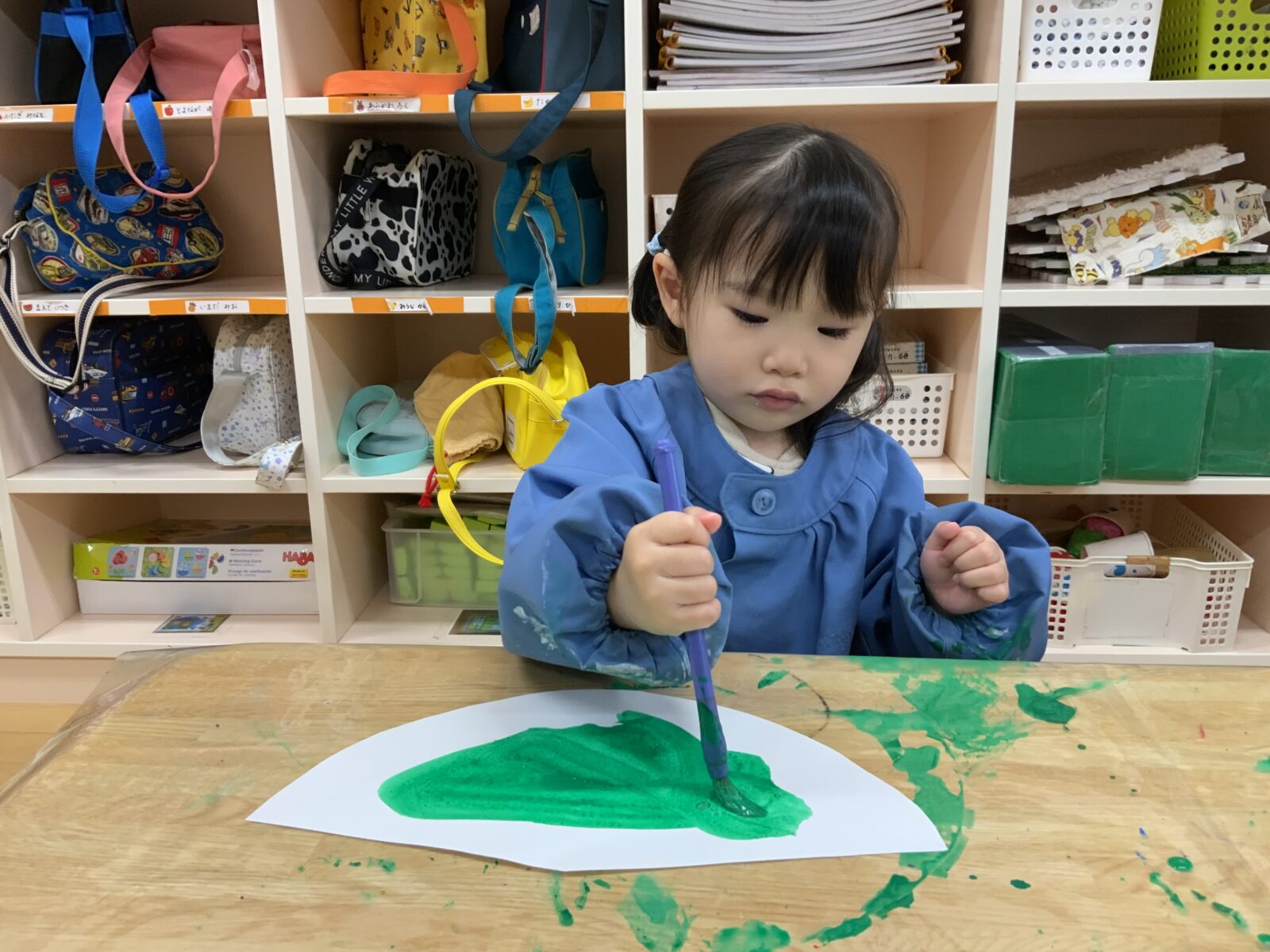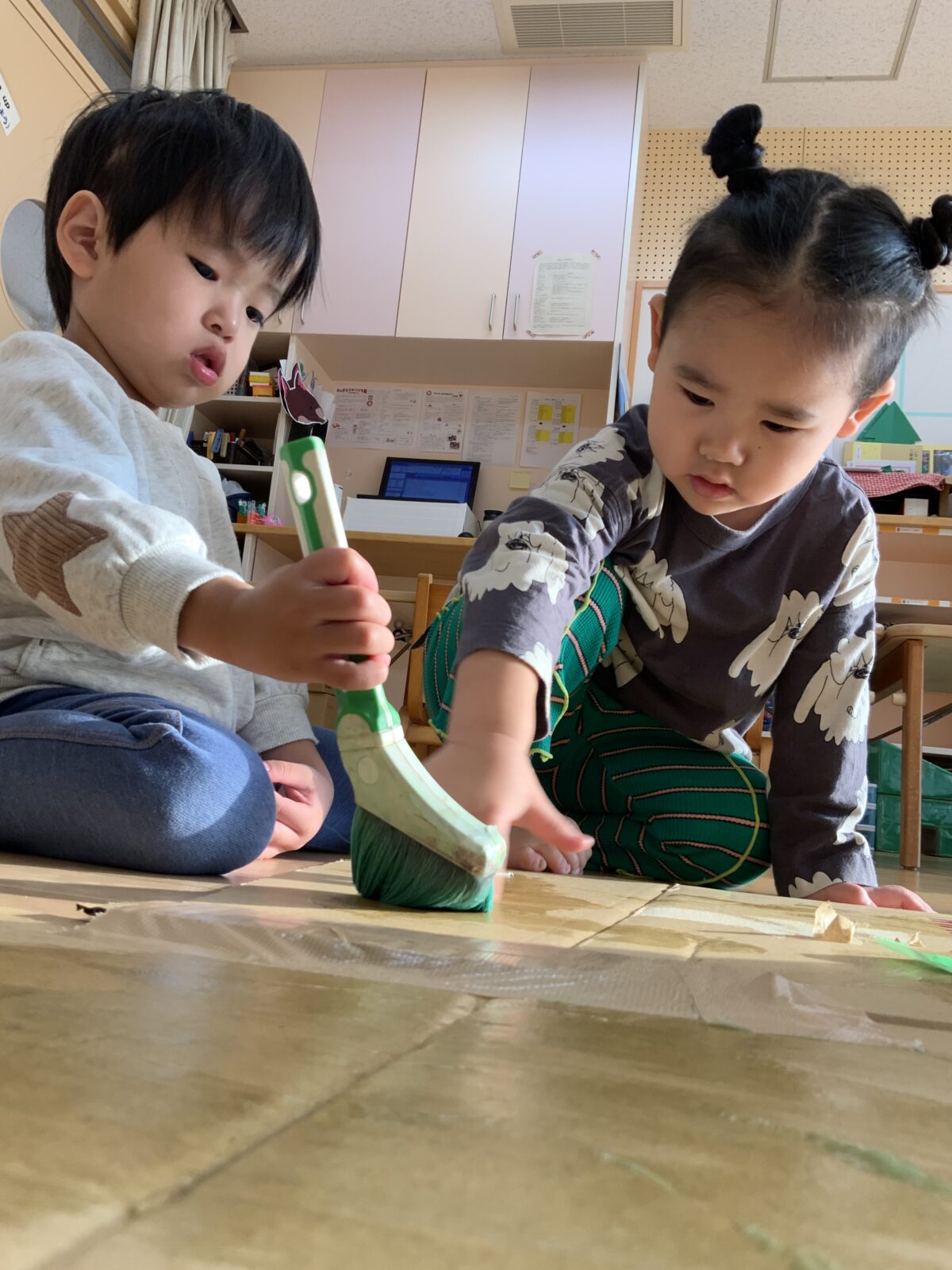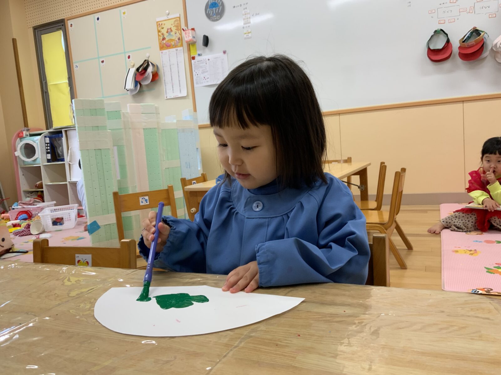 絵の具でぬりぬり♪白いところがなくなるまで丁寧に集中して塗る子どもたち。