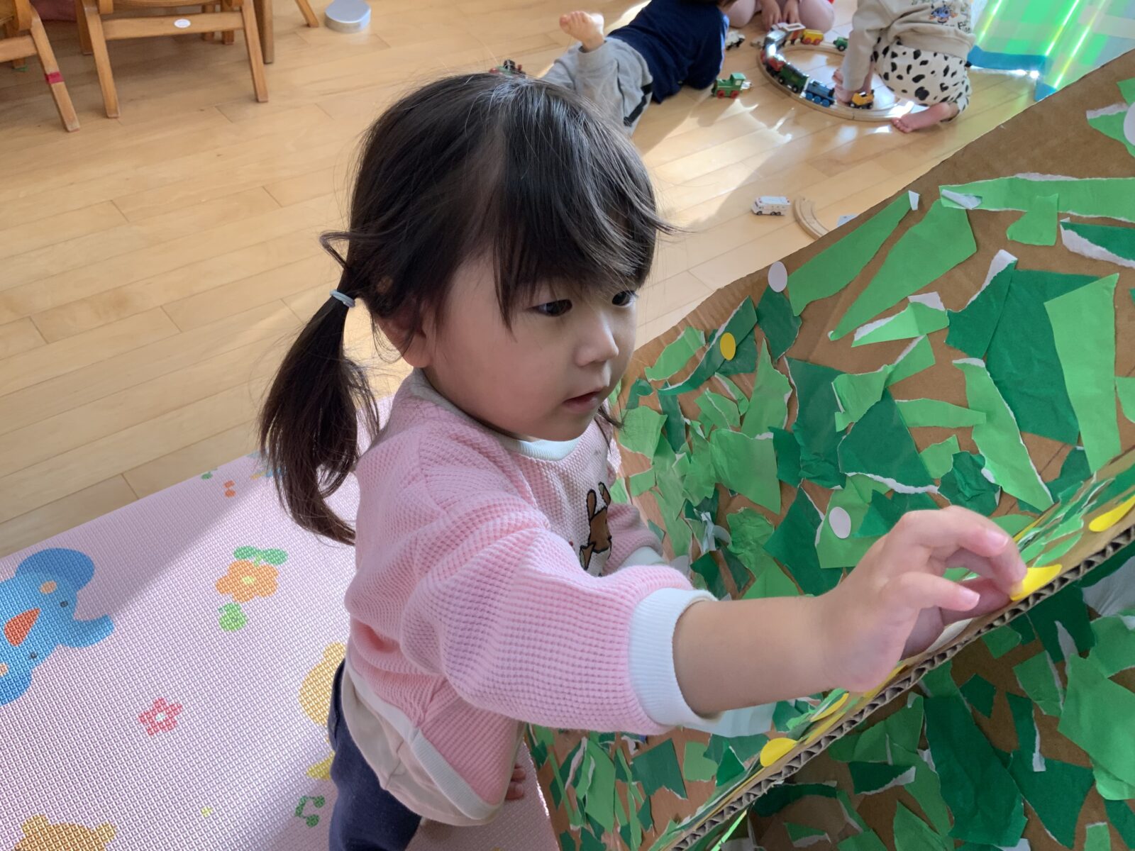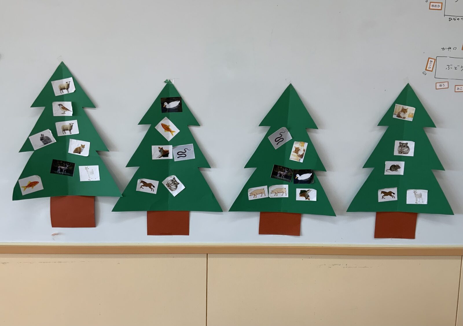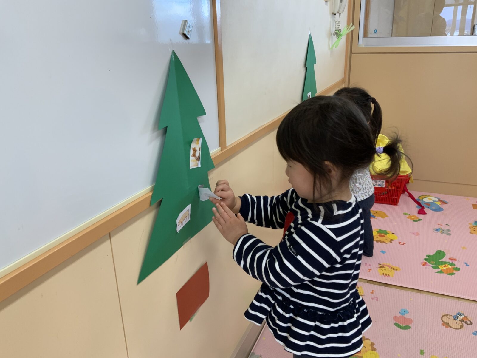 ツリーに動物のオーナメントをペッタン!と飾り付け。