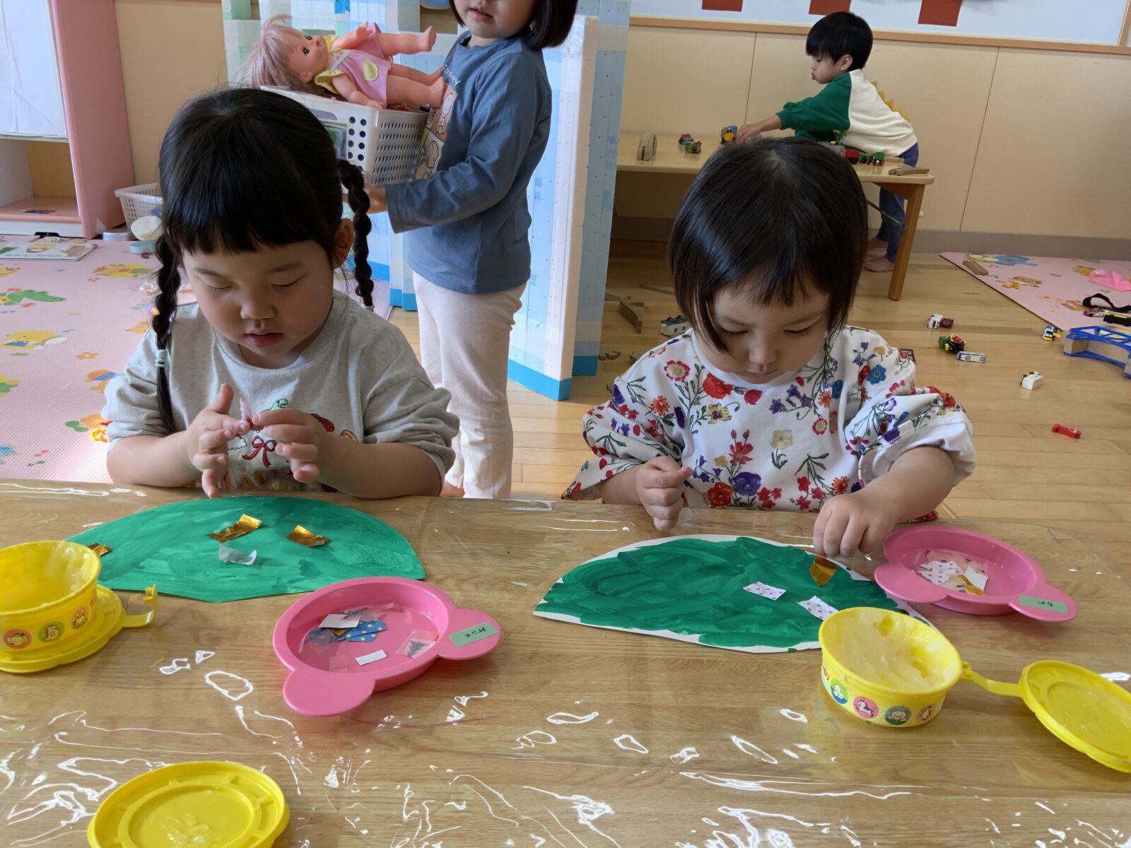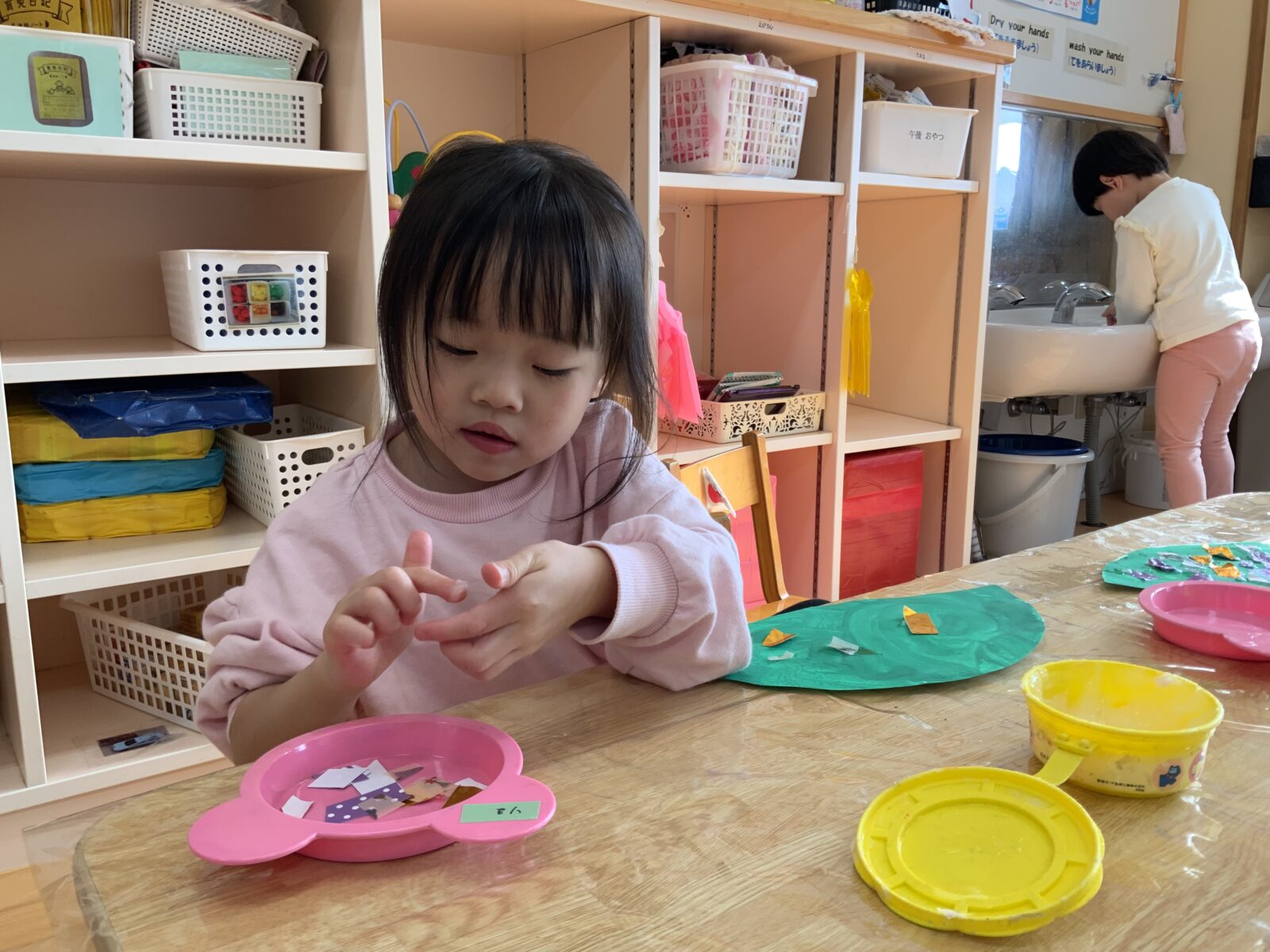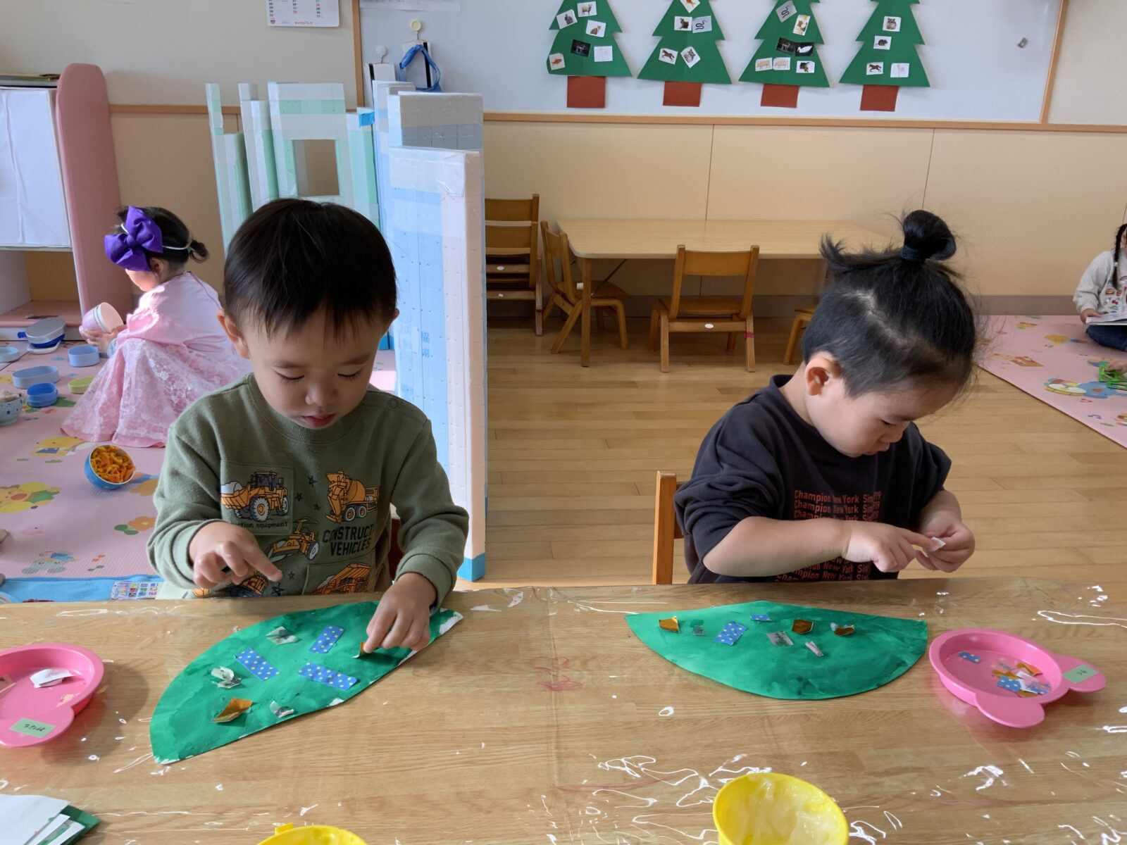 自分たちでハサミを使って切った折り紙をのりでペッタン!