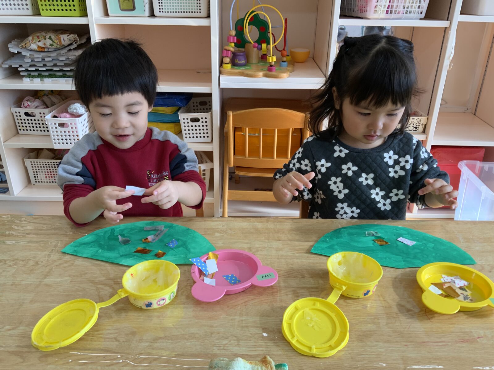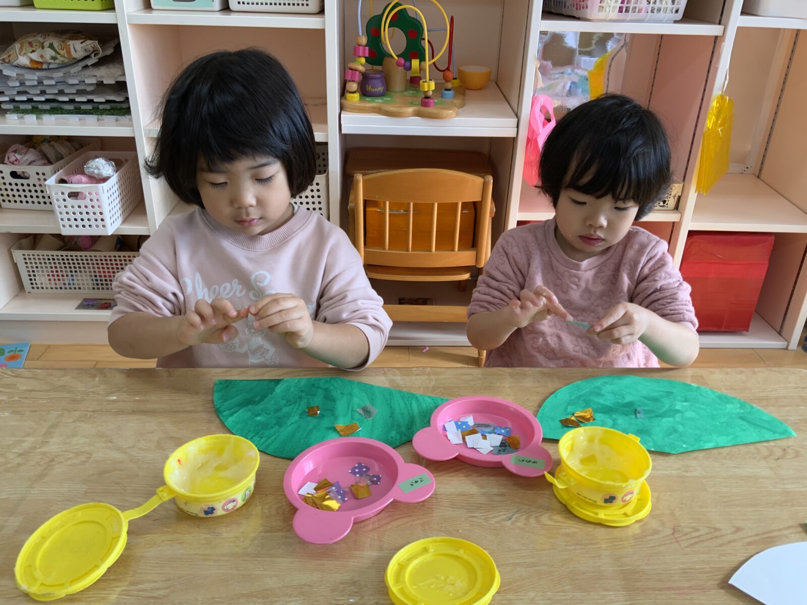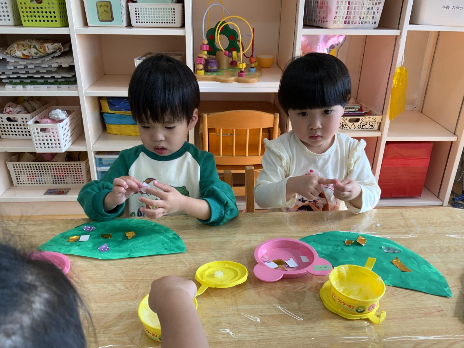 自分たちでハサミを使って切った折り紙をのりでペッタン!