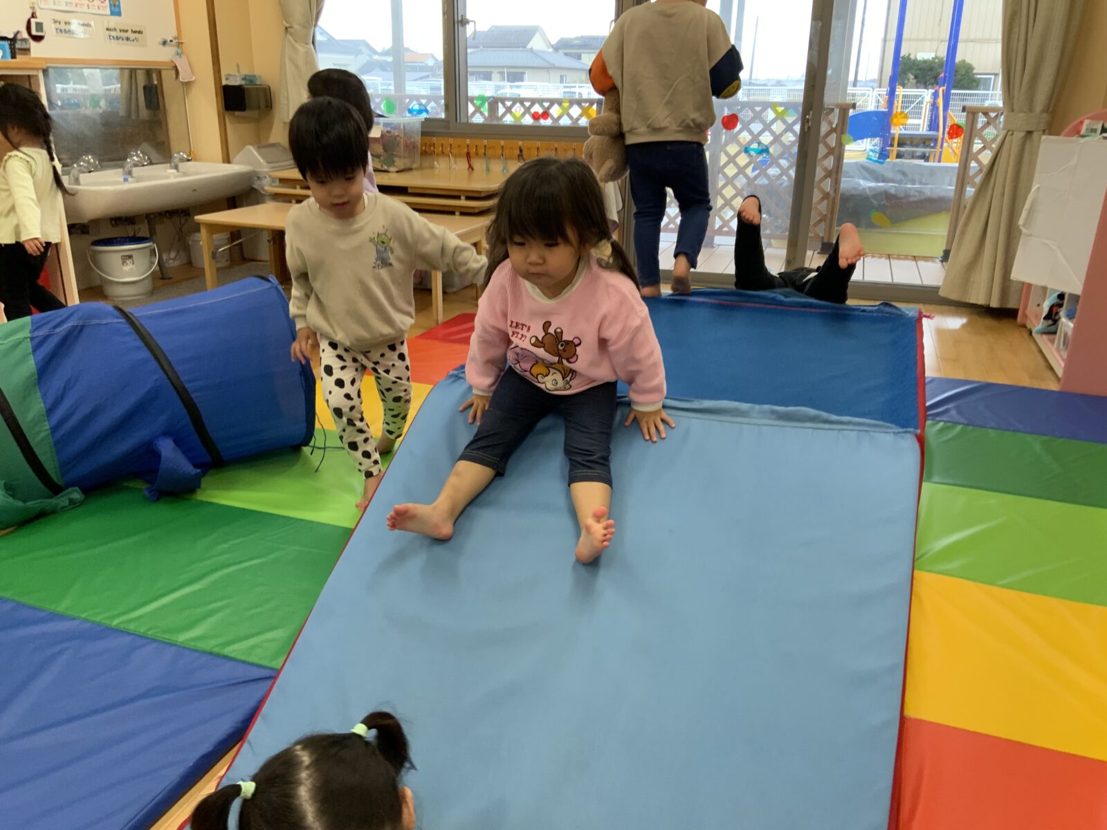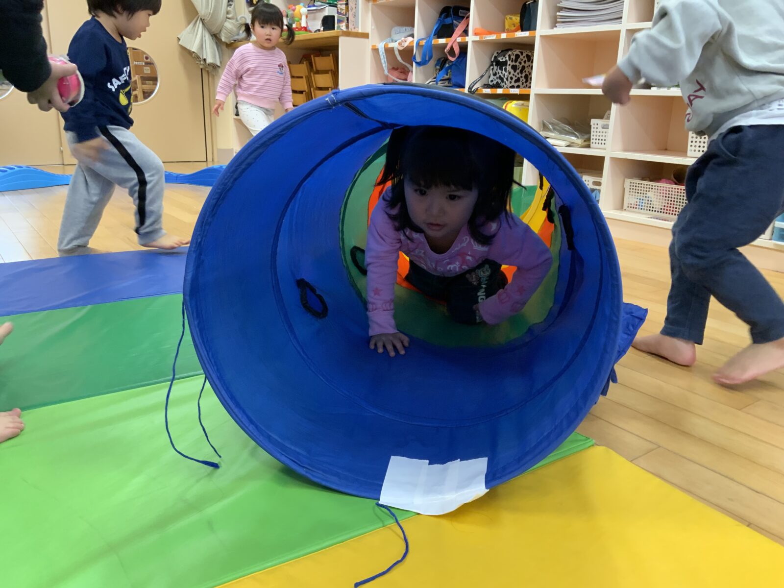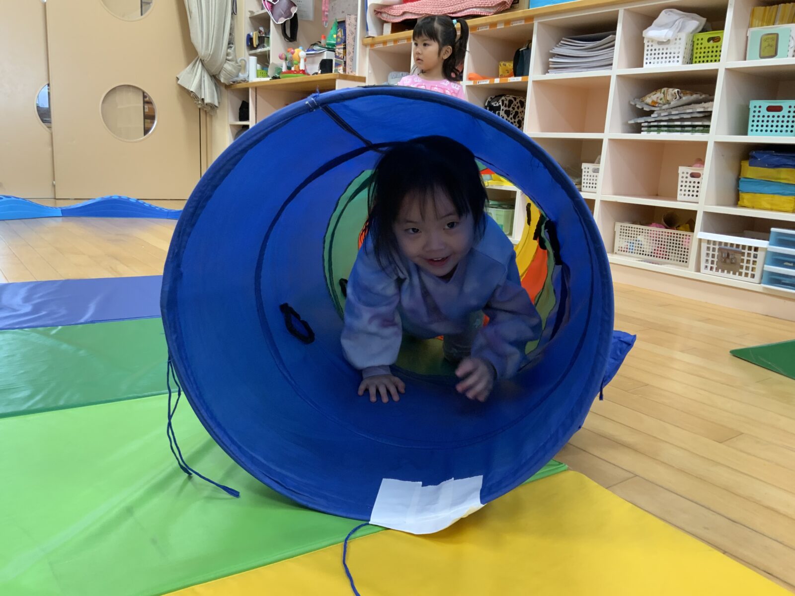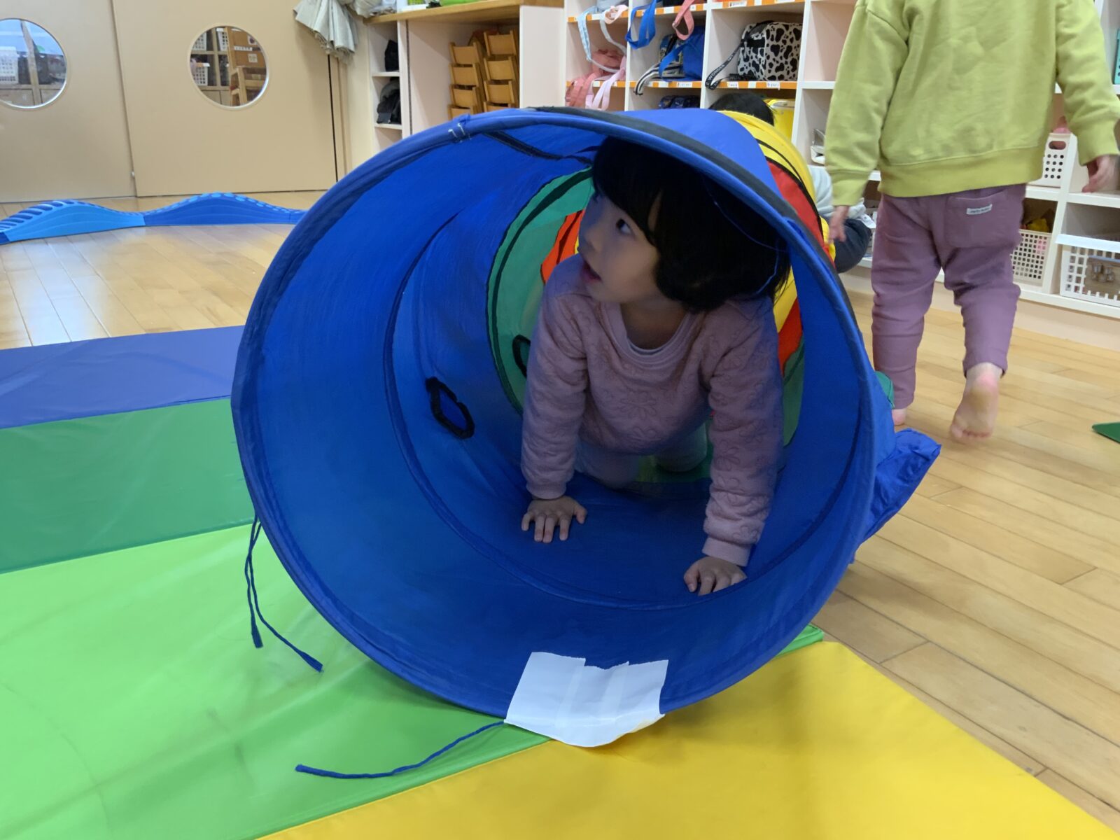 お部屋にウレタンマットやウェーブランス、トンネルなどを用意し身体を動かすことを楽しみました。