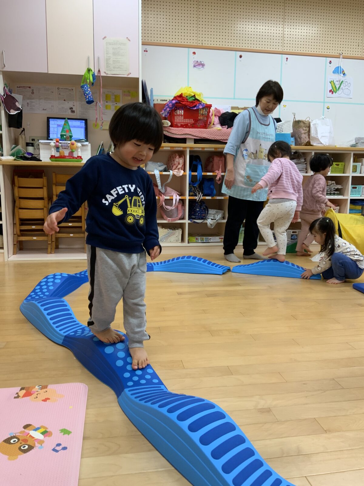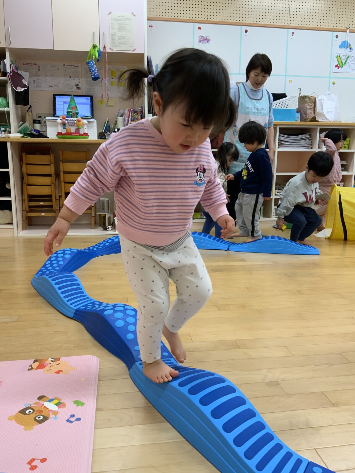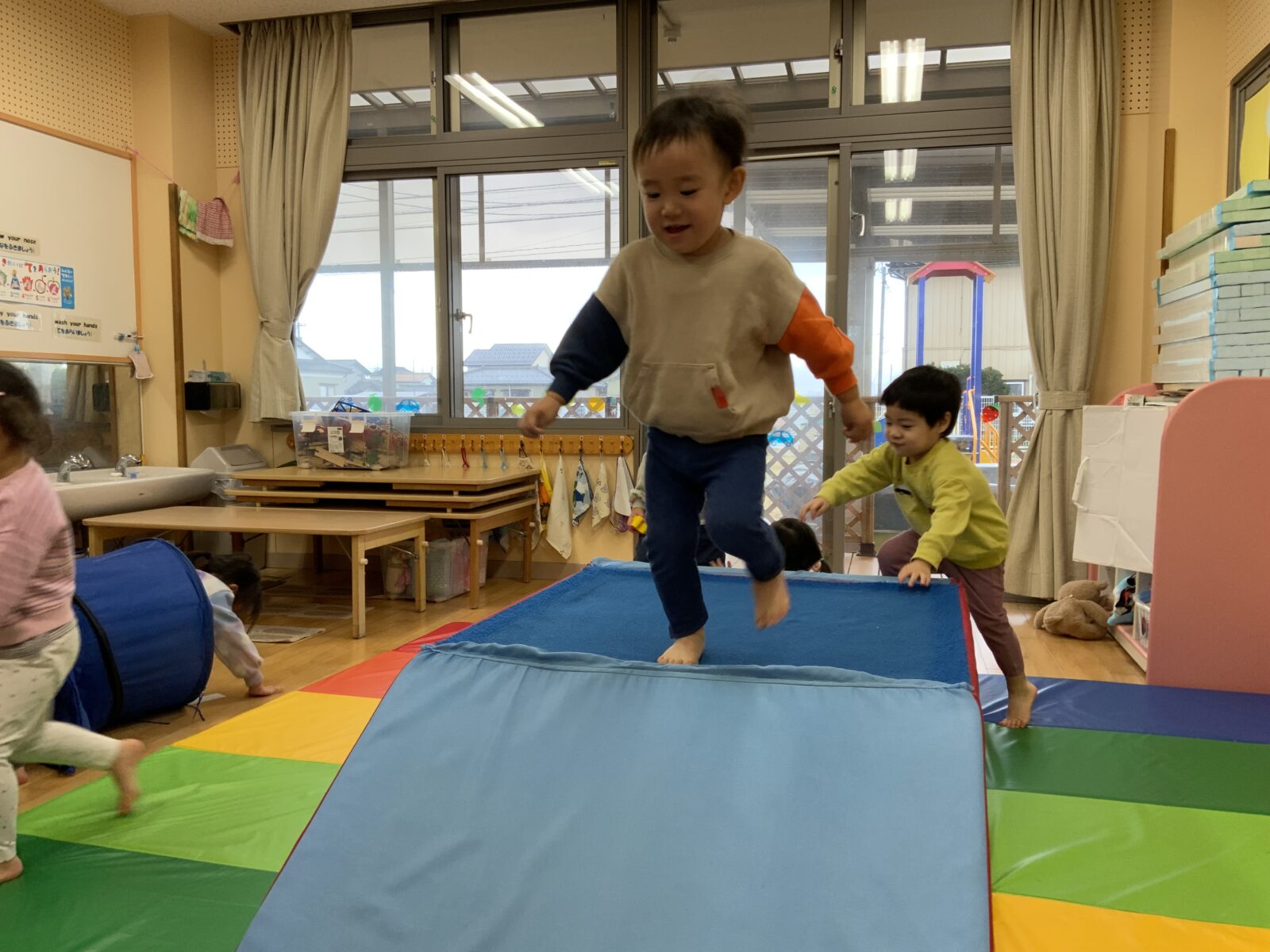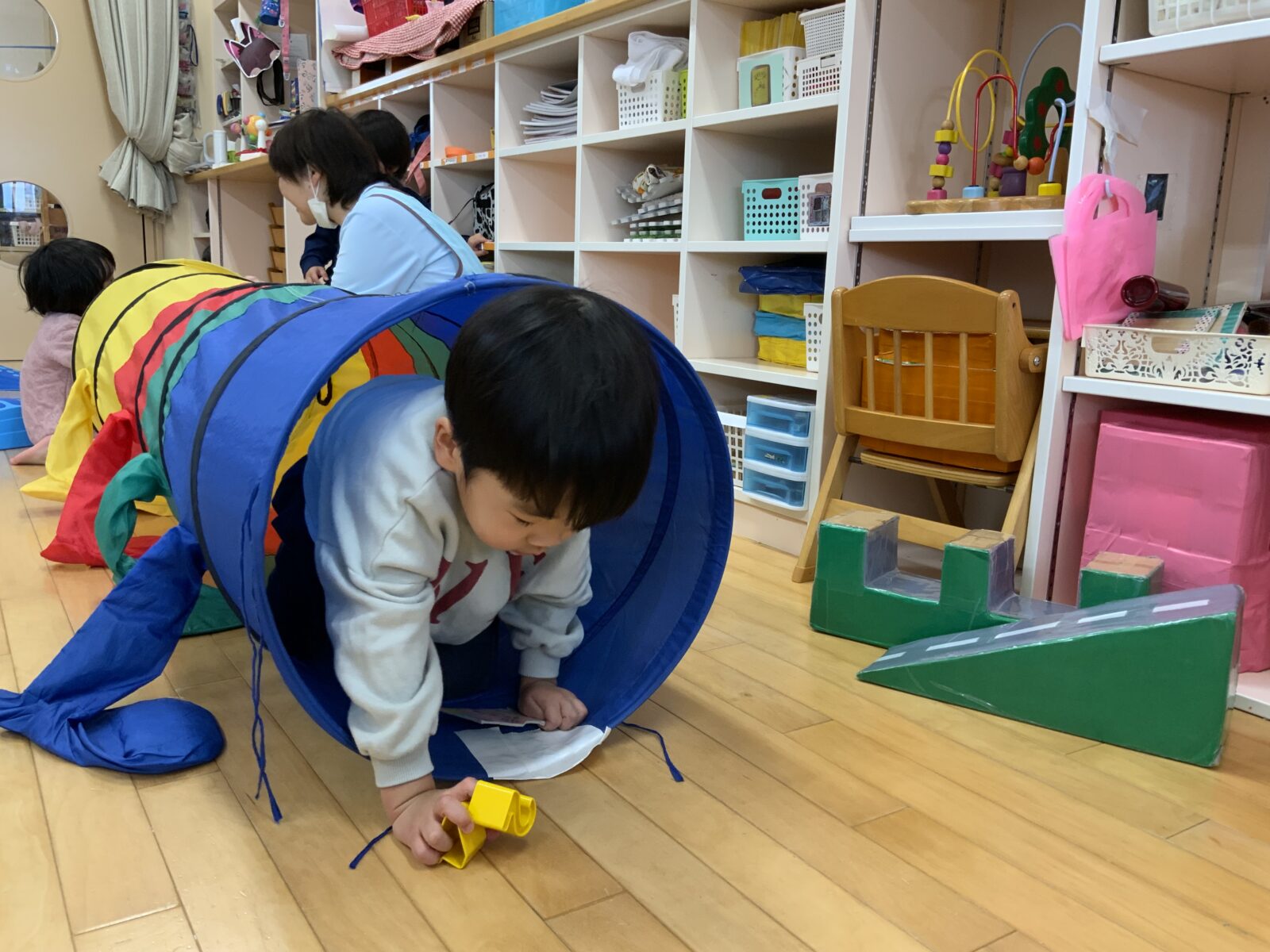お部屋にウレタンマットやウェーブランス、トンネルなどを用意し身体を動かすことを楽しみました。