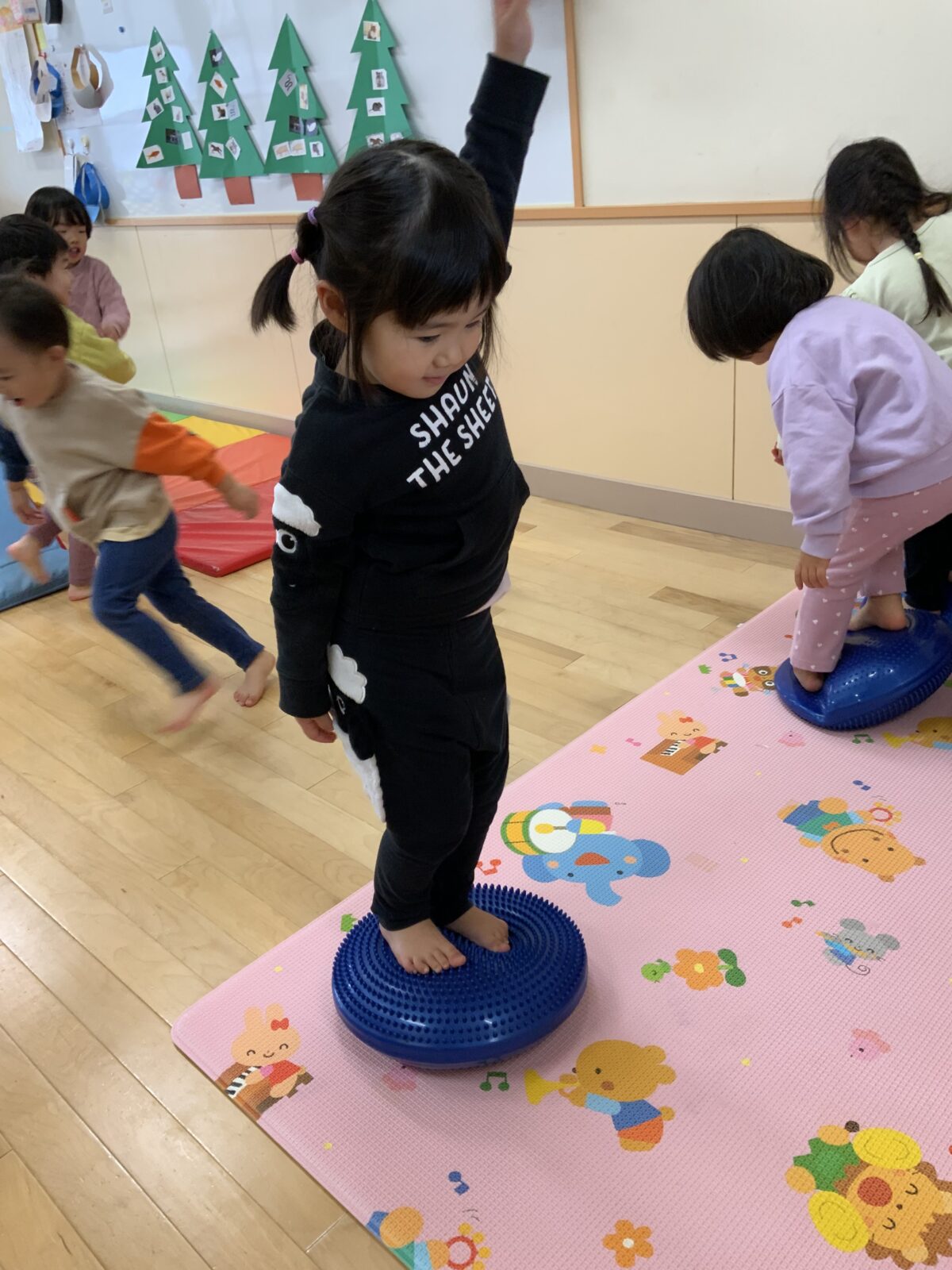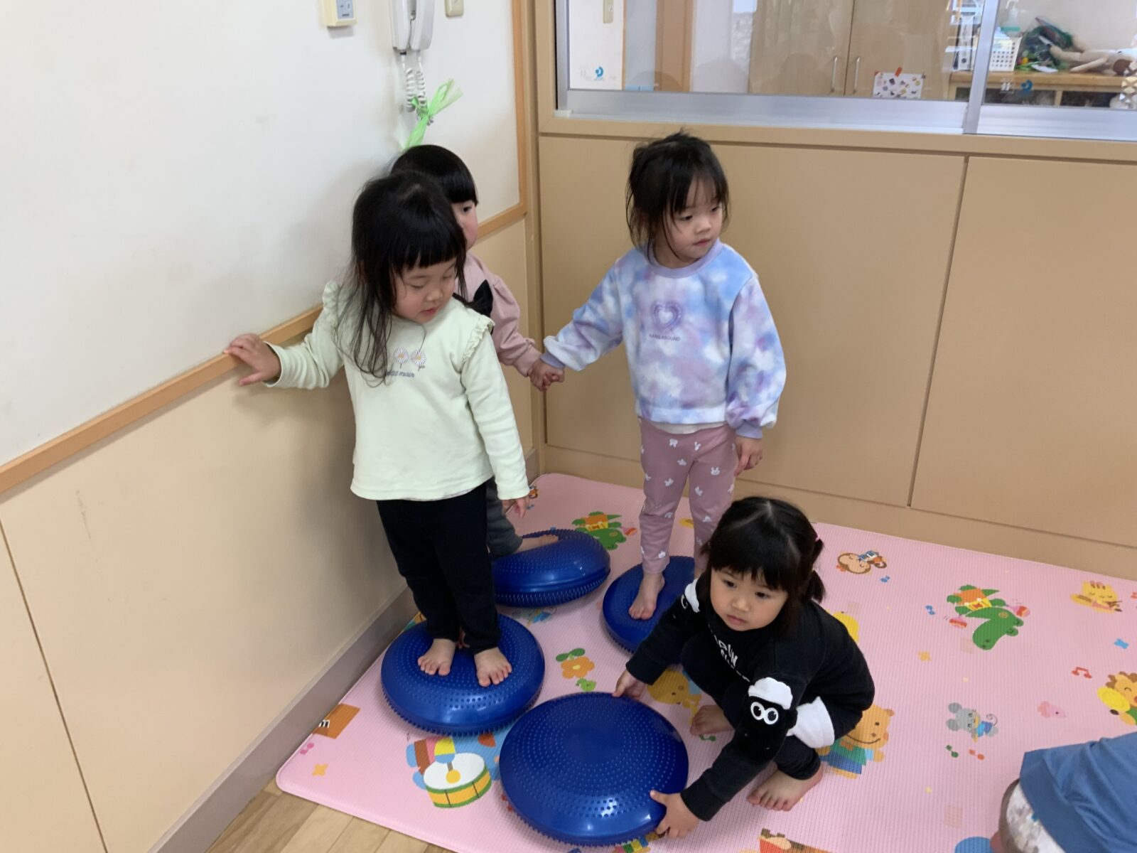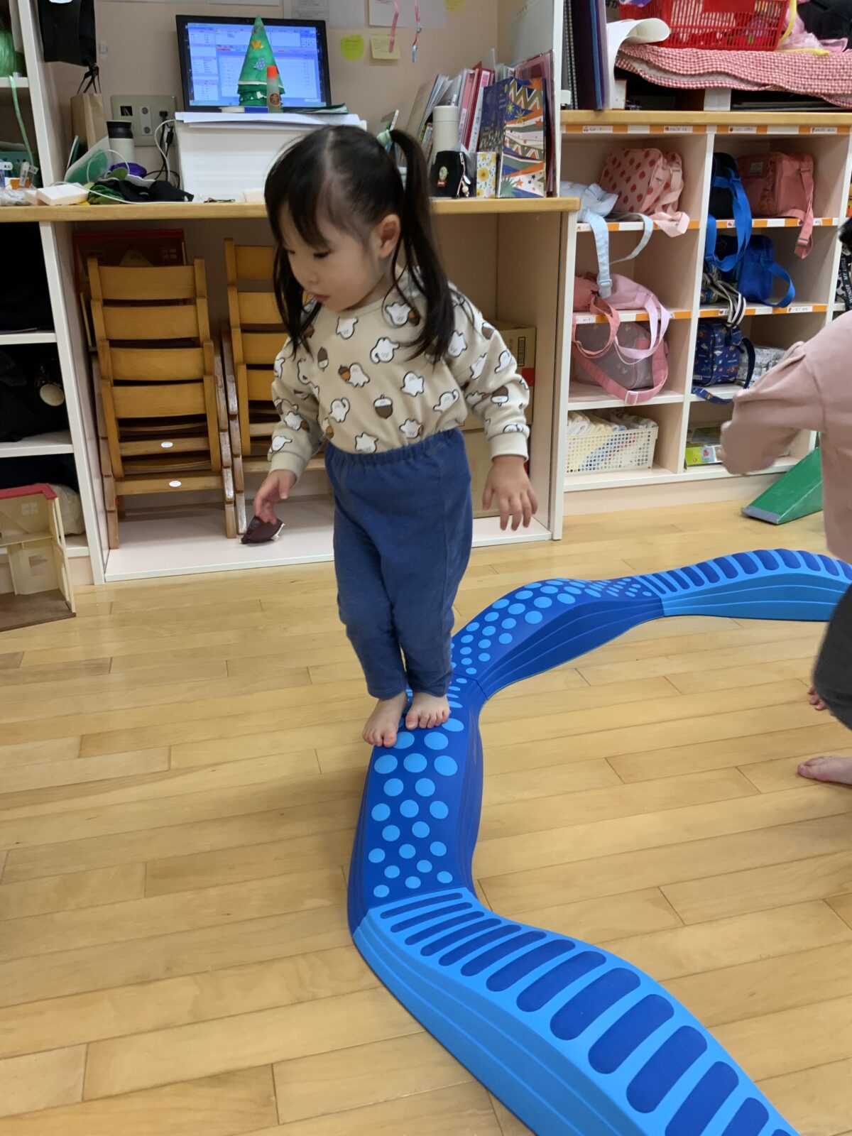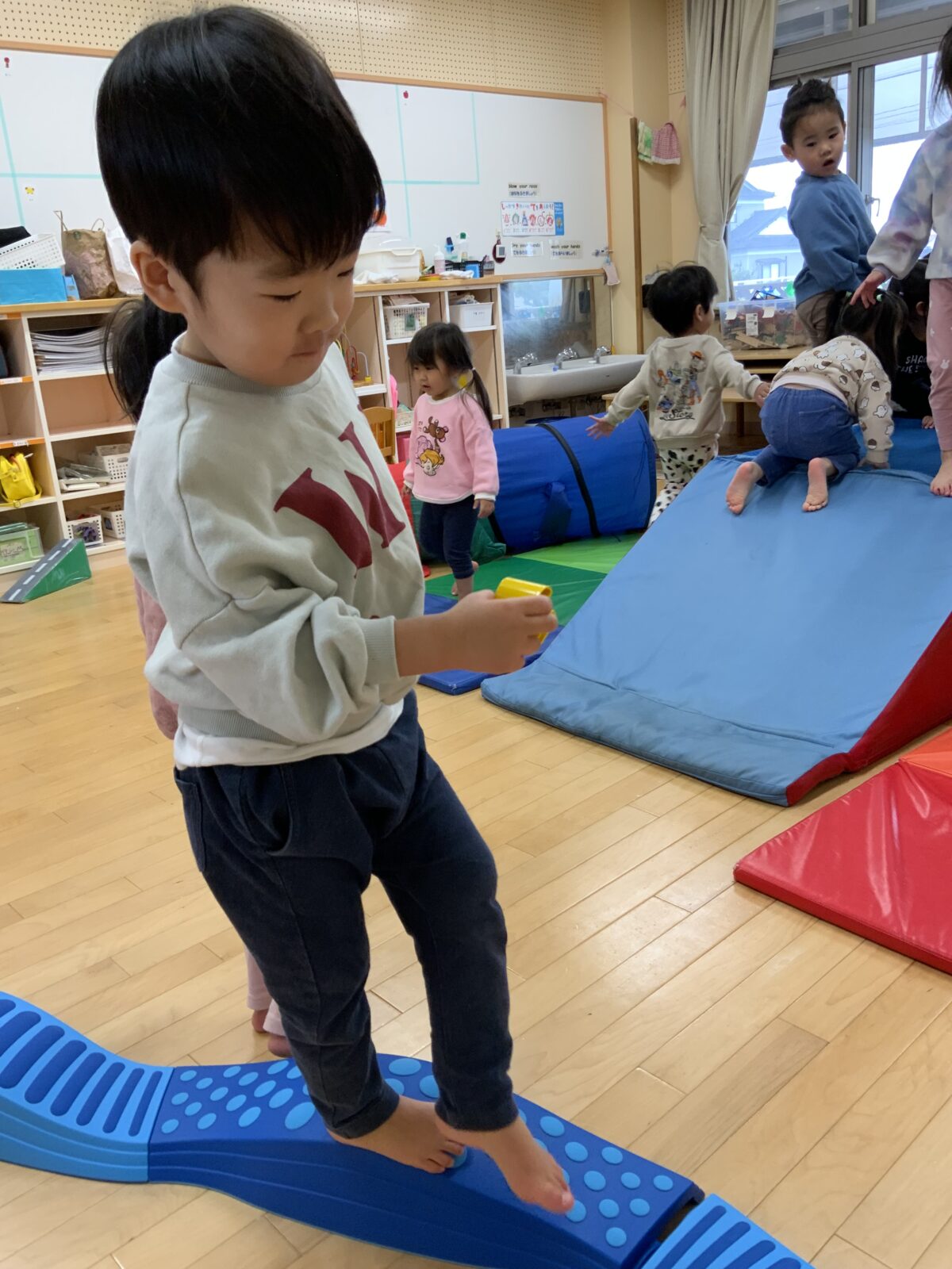 お部屋にウレタンマットやウェーブランス、トンネルなどを用意し身体を動かすことを楽しみました。