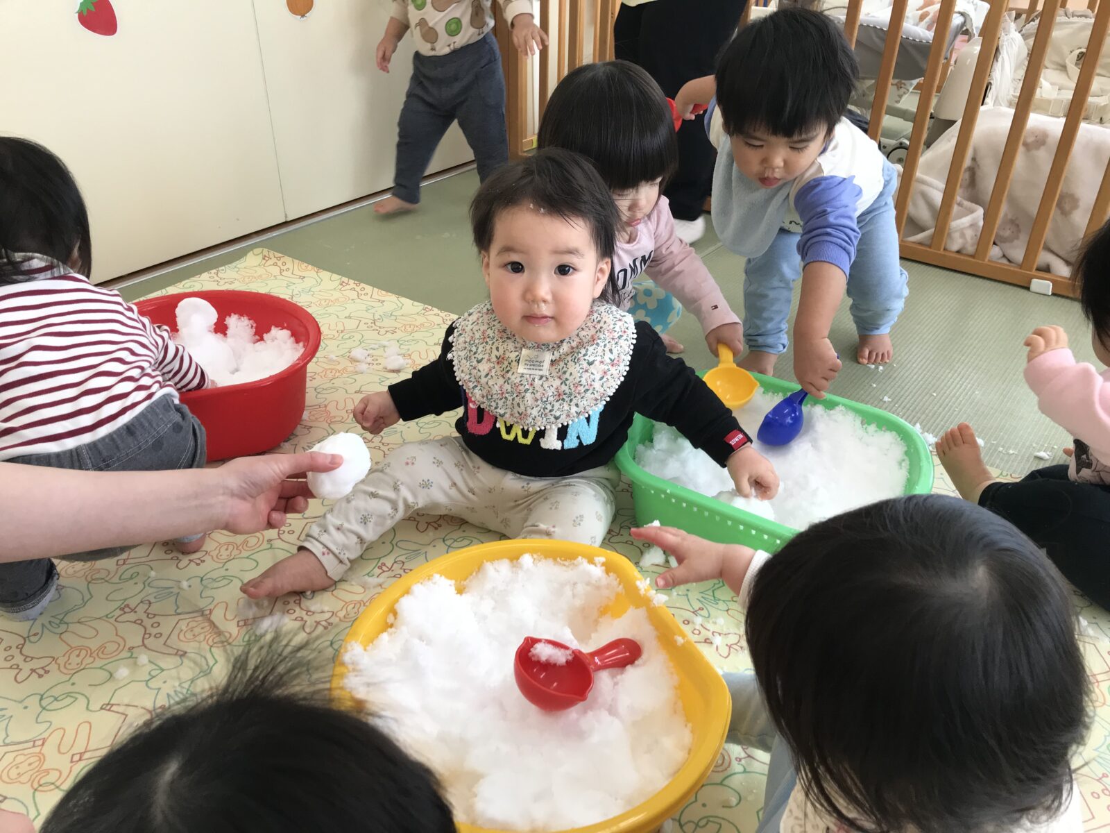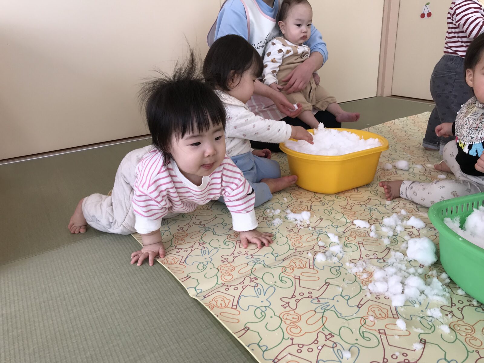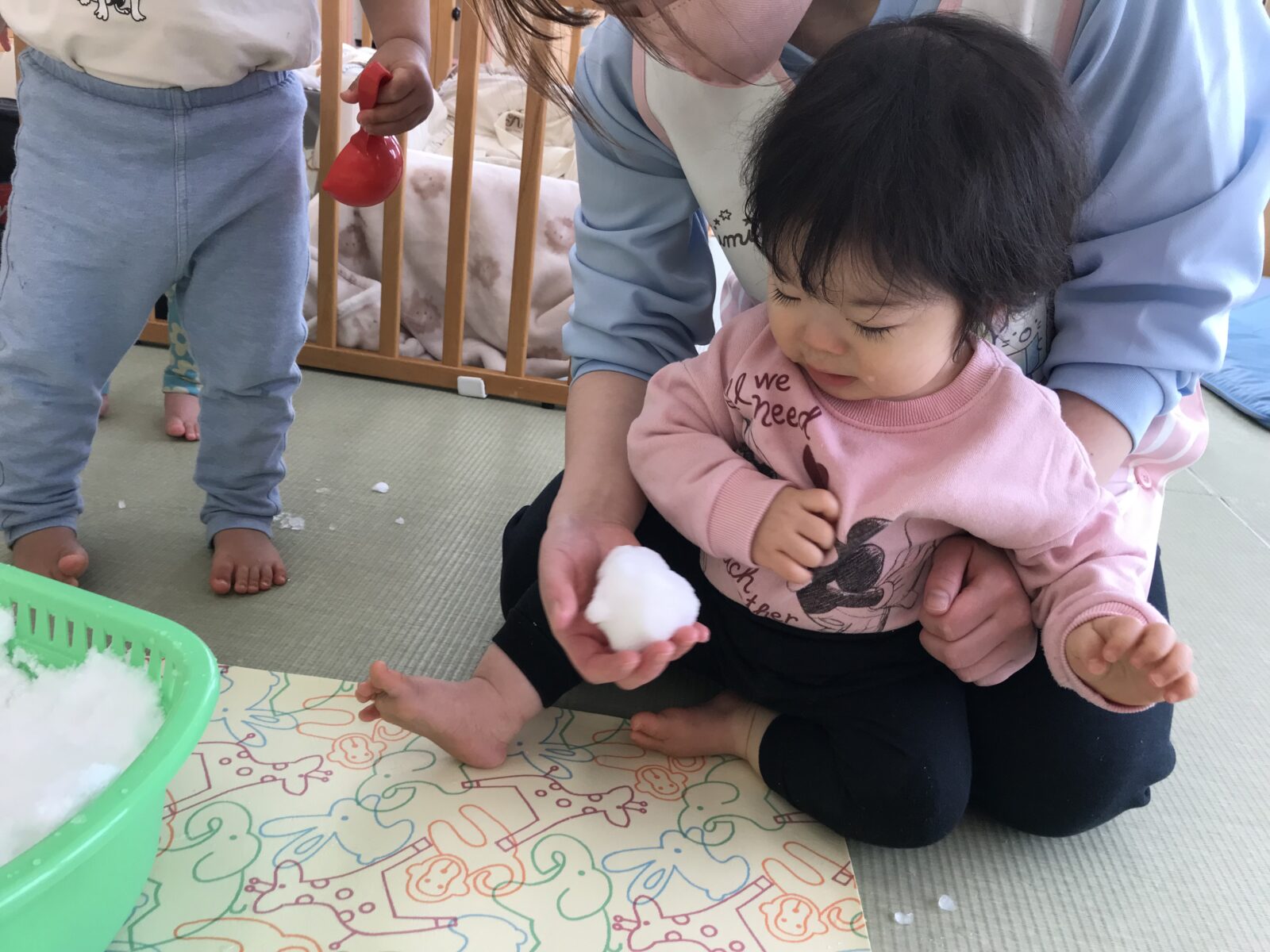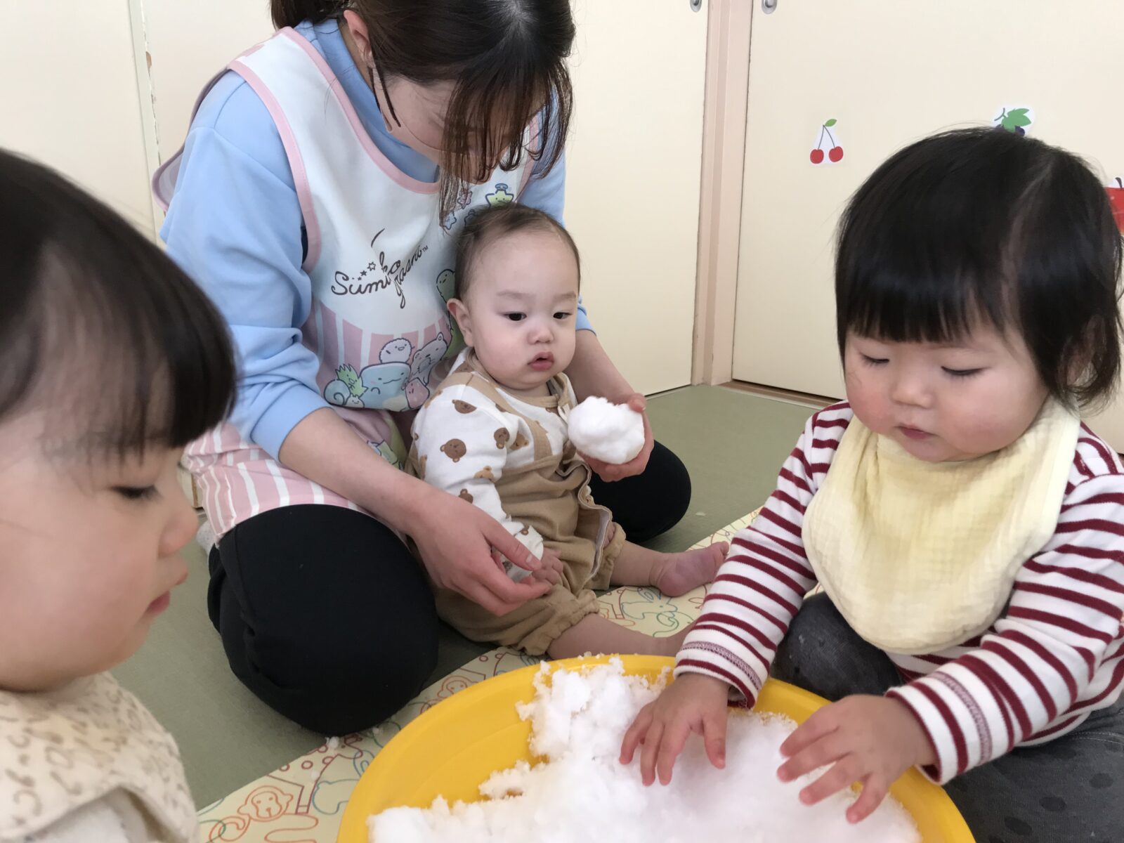 冷たさに驚いて思わず泣いてしまう子もいましたが、ちょんちょんと指先で触ってみたり、先生の膝に座って見てみたりして、できる範囲で楽しみました♪