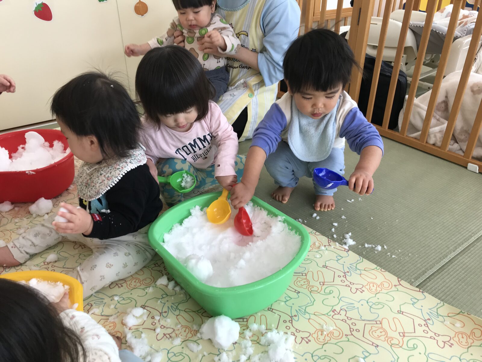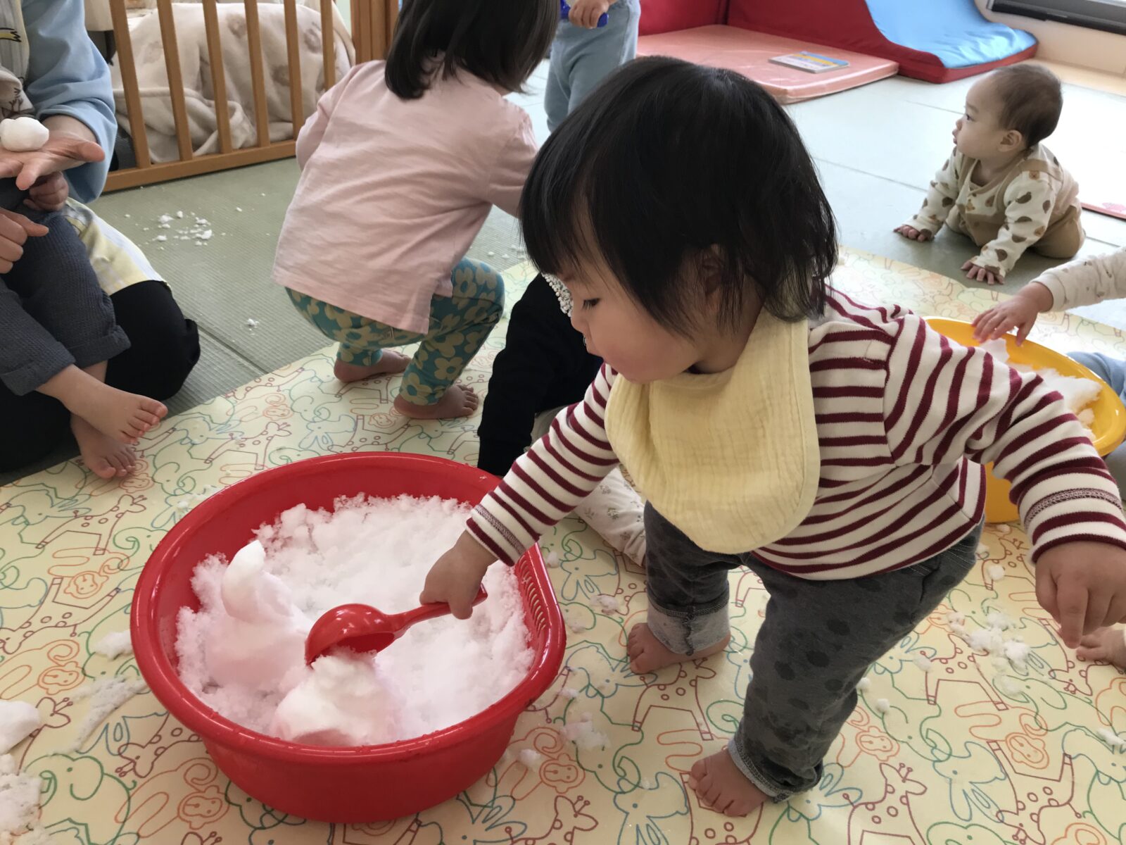 また今月は雪もたくさん降ったので、お部屋の中で雪遊びを楽しみました。