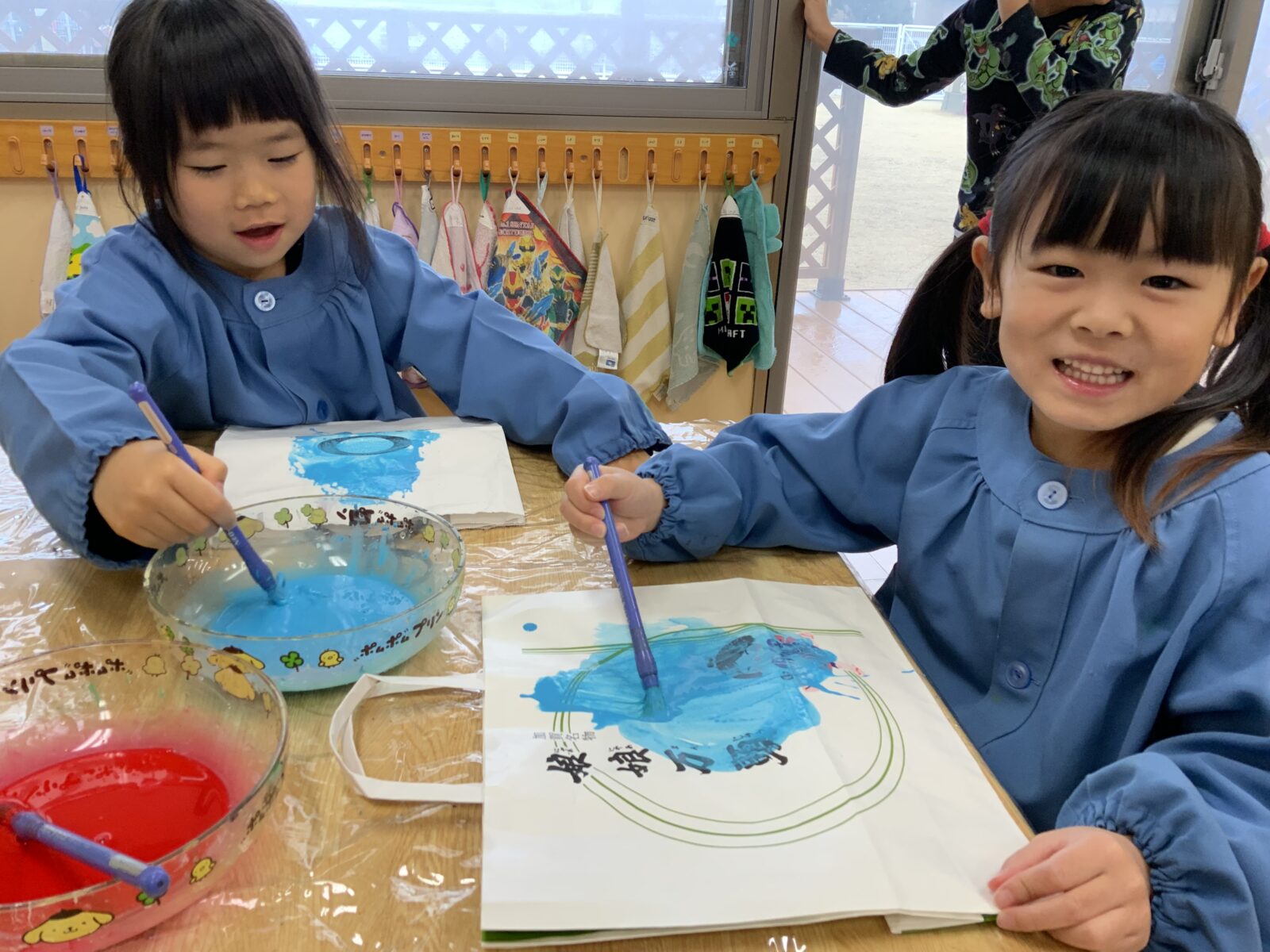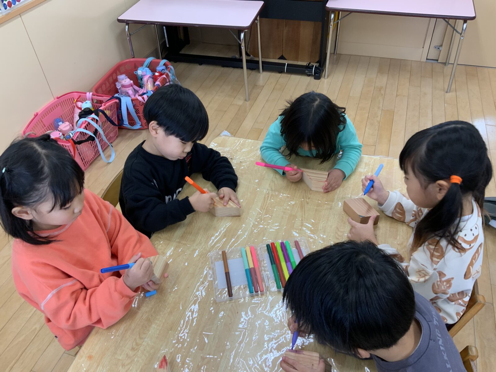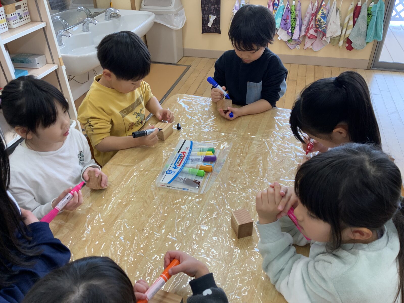 【4,5歳児】鬼のお面と木育ひろば 投稿日: 2026年1月29日 投稿者: すえさみこども園 2月3日の節分の日に向けて鬼のお面作りをしました。 紙袋を選び、好きな色の絵の具を塗りましたよ。「何色にしようかな~」と悩む子やすぐに色が決まる子がいましたよ。 紙袋を頭にかぶるか、帽子のようにするかも自分たちで決めましたよ。 ほっぺをつけたり、毛糸で髪の毛にしたりと工夫していましたね。 26日に高校生のお兄ちゃん、お姉ちゃんが園に来てくれて木育ひろばがありました。 木の匂いを嗅いだり、重さ比べをしました。 また、木に好きな絵も描きました。集中して描いていましたね。 だるまさんが転んだやじゃんけん列車を一緒に楽しむことができとても喜んでいた子どもたちでした☺ 関連記事: 【0歳児】おひなさま製作 [0歳児]離乳食おいしいね! [0歳児]初めてのクッキング [2歳児]色塗りしたよ♪