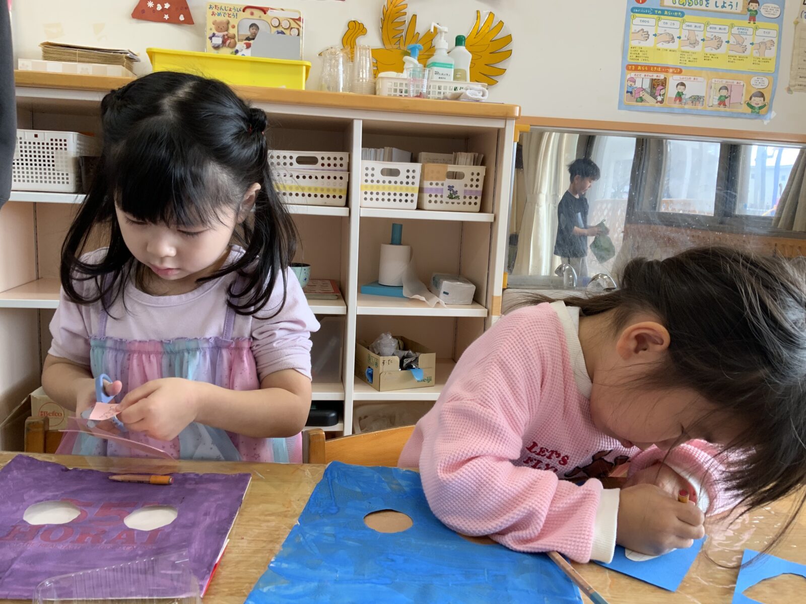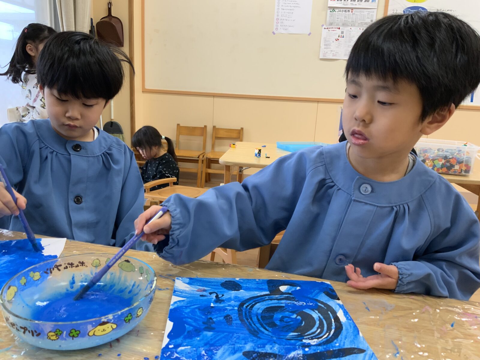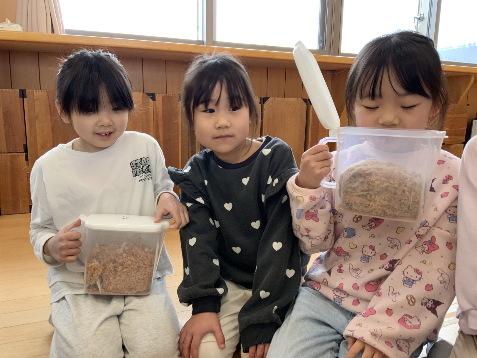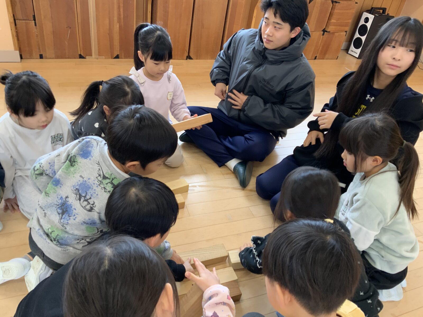 【4,5歳児】鬼のお面と木育ひろば 投稿日: 2026年1月29日 投稿者: すえさみこども園 2月3日の節分の日に向けて鬼のお面作りをしました。 紙袋を選び、好きな色の絵の具を塗りましたよ。「何色にしようかな~」と悩む子やすぐに色が決まる子がいましたよ。 紙袋を頭にかぶるか、帽子のようにするかも自分たちで決めましたよ。 ほっぺをつけたり、毛糸で髪の毛にしたりと工夫していましたね。 26日に高校生のお兄ちゃん、お姉ちゃんが園に来てくれて木育ひろばがありました。 木の匂いを嗅いだり、重さ比べをしました。 また、木に好きな絵も描きました。集中して描いていましたね。 だるまさんが転んだやじゃんけん列車を一緒に楽しむことができとても喜んでいた子どもたちでした☺ 関連記事: 【0歳児】おひなさま製作 [0歳児]離乳食おいしいね! [0歳児]初めてのクッキング [2歳児]色塗りしたよ♪